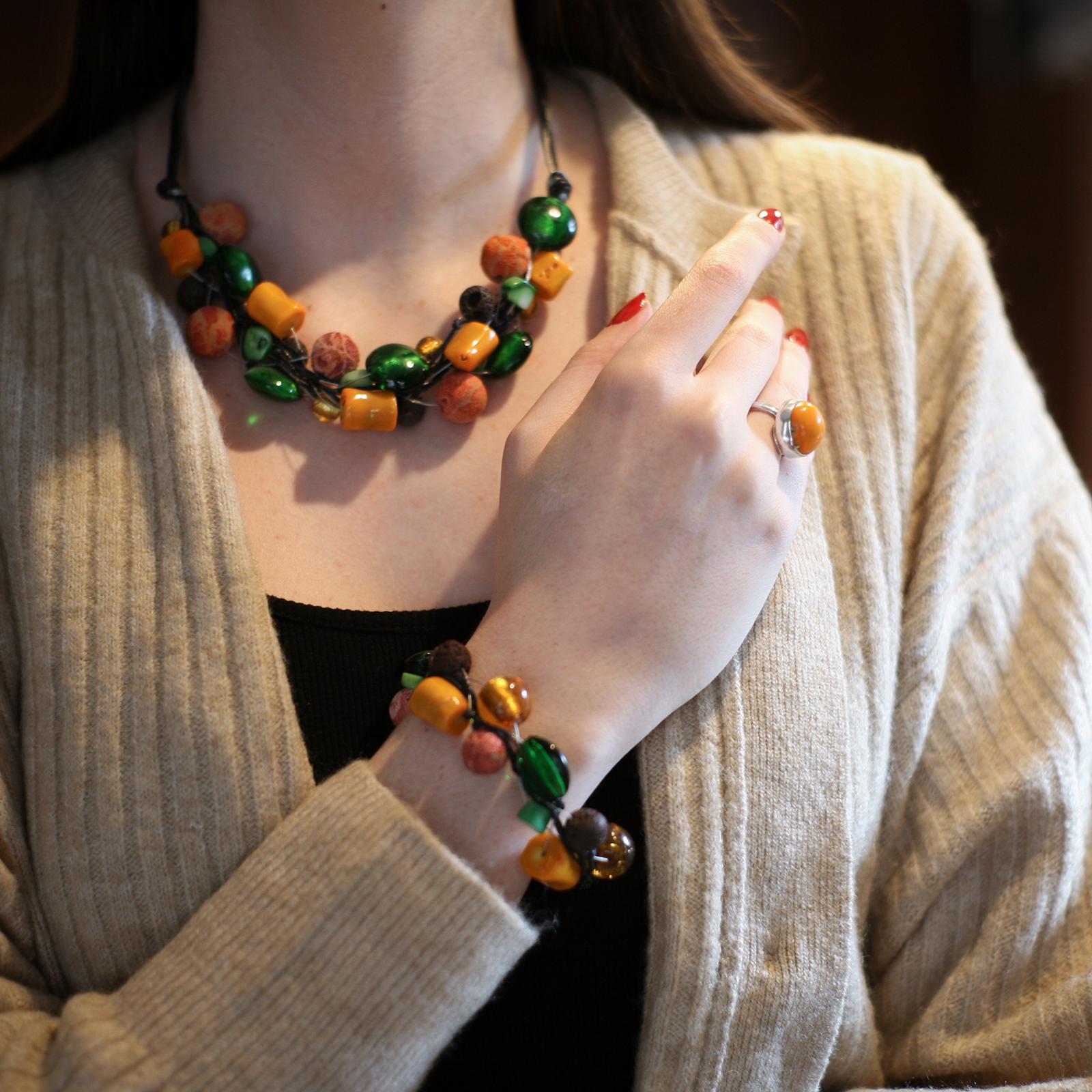 Naszyjnik Sieć Klasyczną z Kolekcji Aromaterapeutycznej ręcznie wykonany z korala żółtego, zielonego i piątkowego, szkła weneckiego oraz brązowej lawy wulkanicznej. Wszystkie kamienie zaplecione są w srebrną linkę jubilerską oraz czarny bawełniany sznurek.