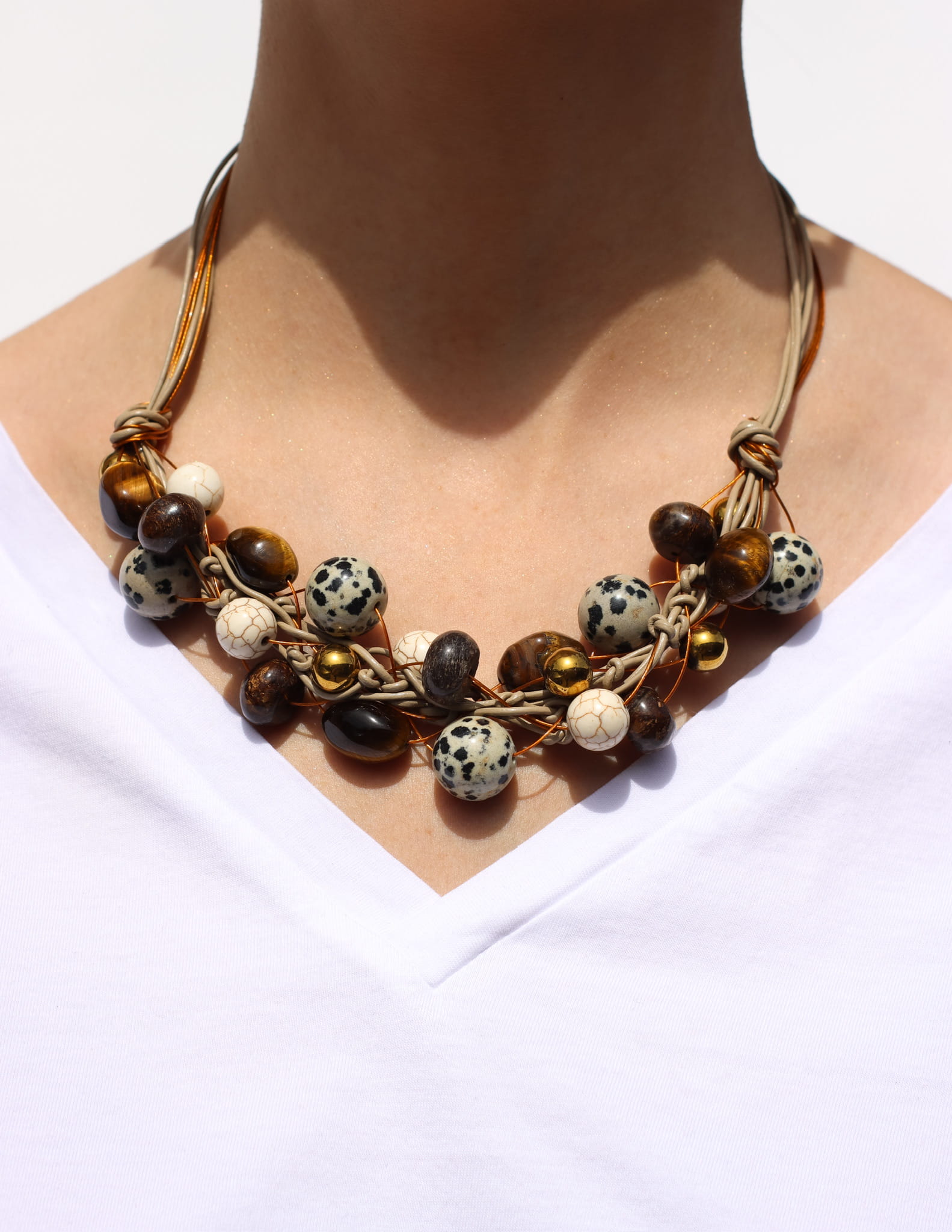 Ręcznie wykonany przez Karinę naszyjnik Beżowa Sieć Exclusive, w której znajdziesz: jaspisy, tygrysie oko, howlity, złoty hematyt. Całość przepleciona złotą linką i rzemieniem w kolorze beżu.