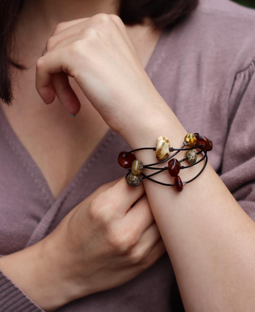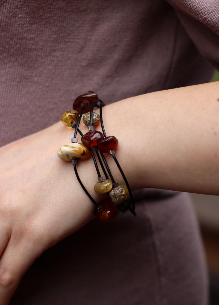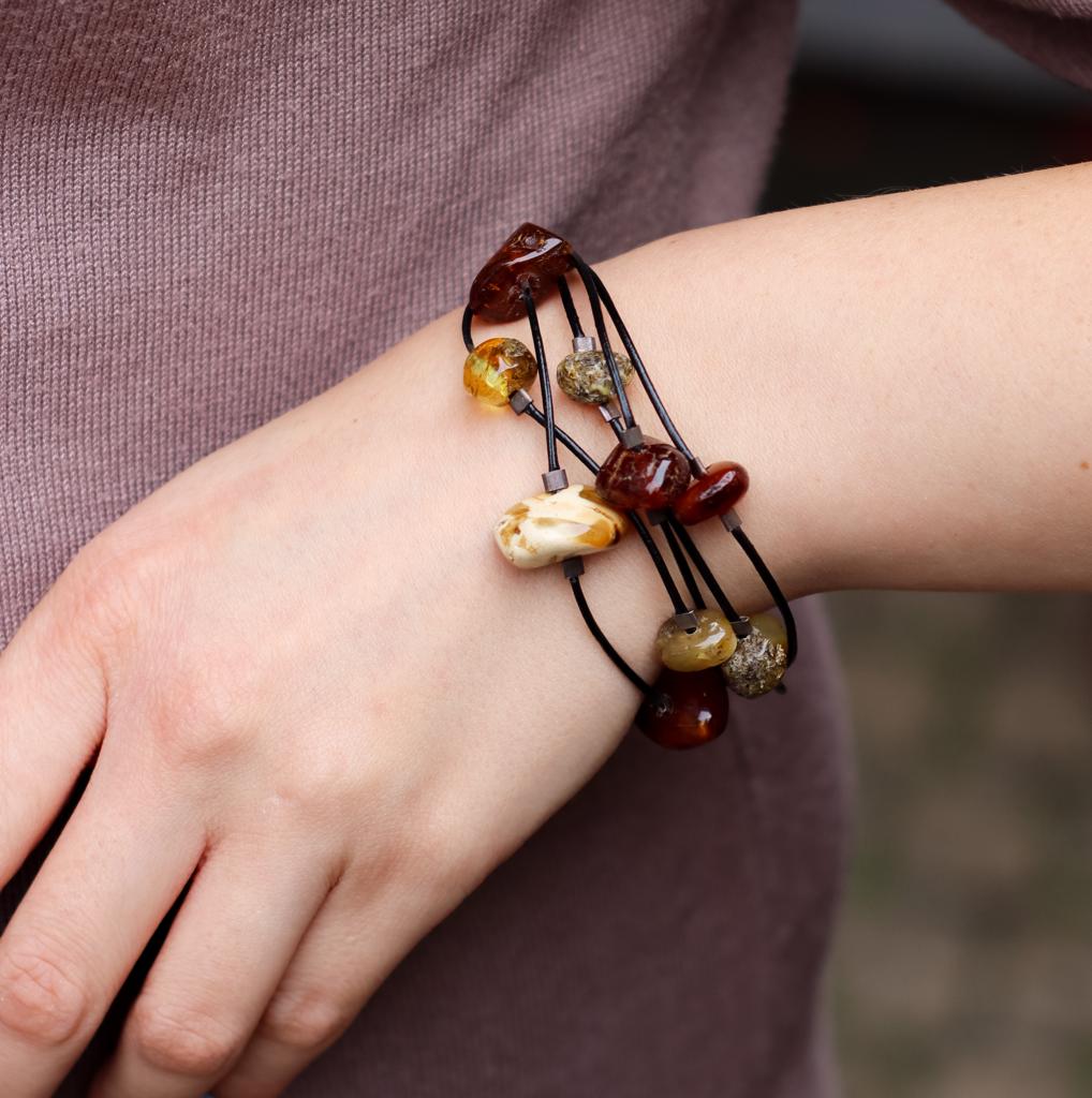 Bransoletka wykonana z bryłek naturalnego bursztynu oraz srebra pr. 925 przeplecionych rzemieniem w kolorze czarnym