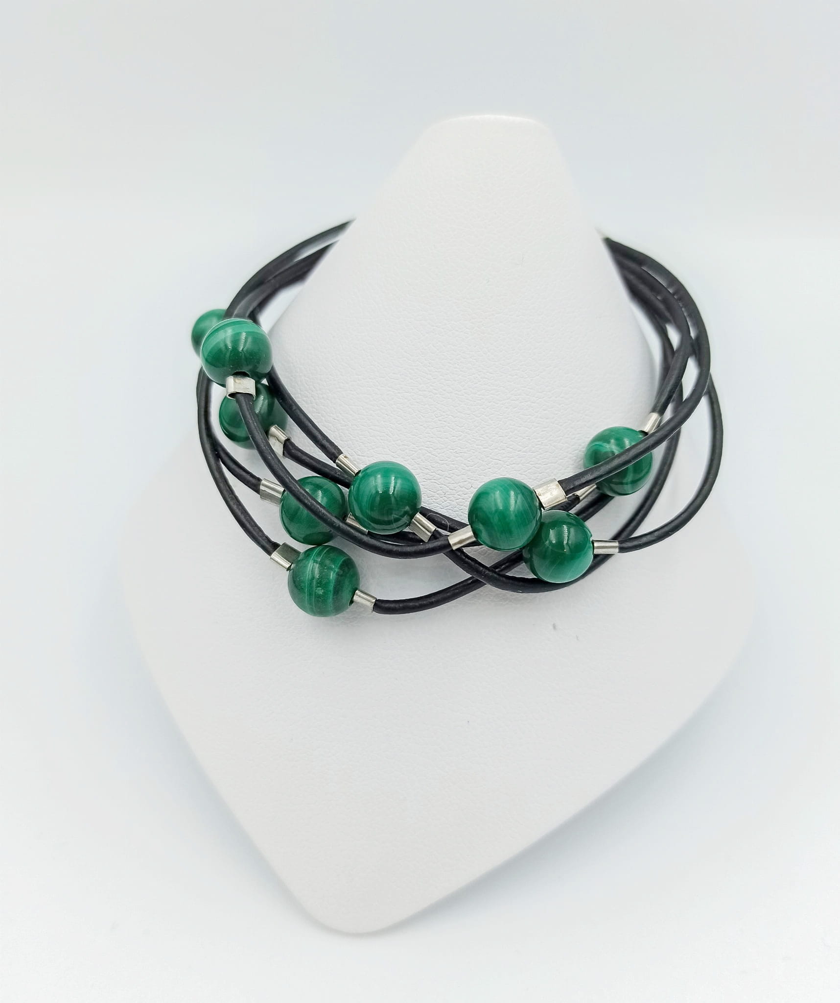 Bransoletka Forsycja w zieleni wykonana z naturalnego malachitu oraz srebra pr. 925 na rzemieniu w kolorze czarnym.