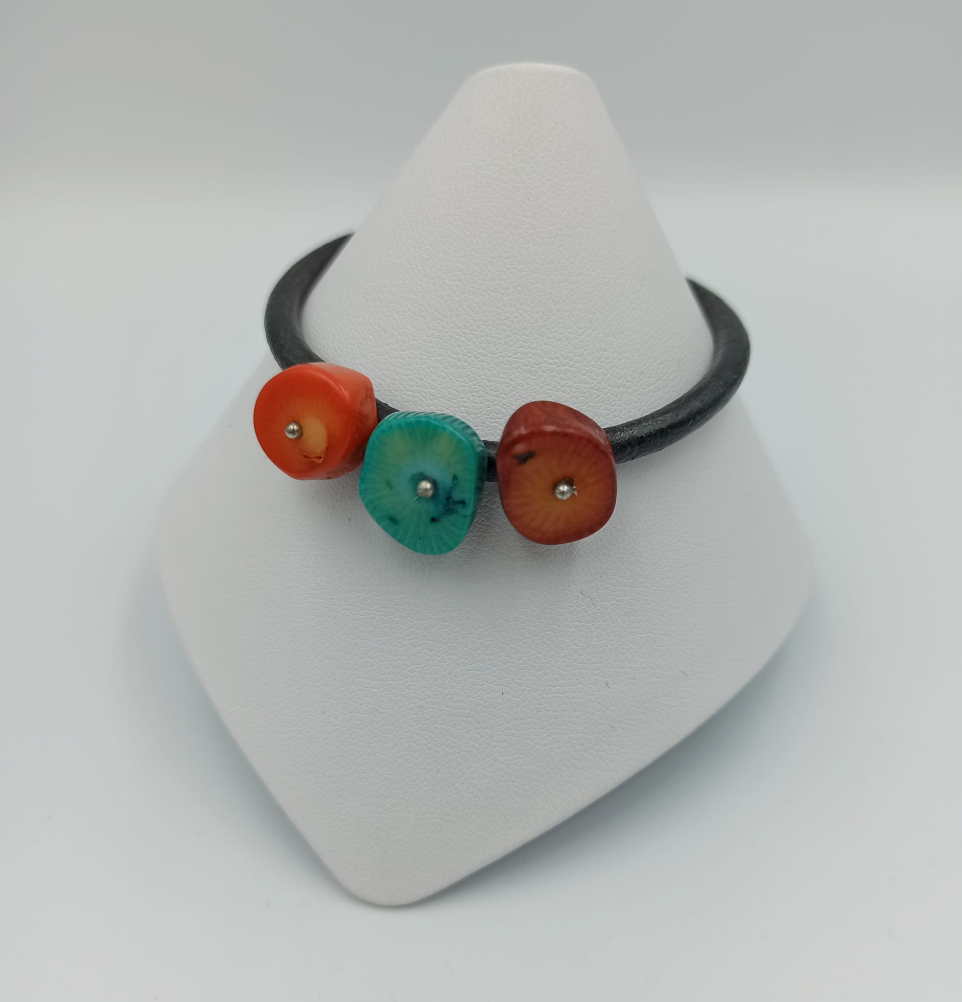 Bransoletka wykonana z kolorowych korali w odcieniach pomarańczu, brązu i morskiego oraz srebra pr. 925 na rzemienia w kolorze czarnym.