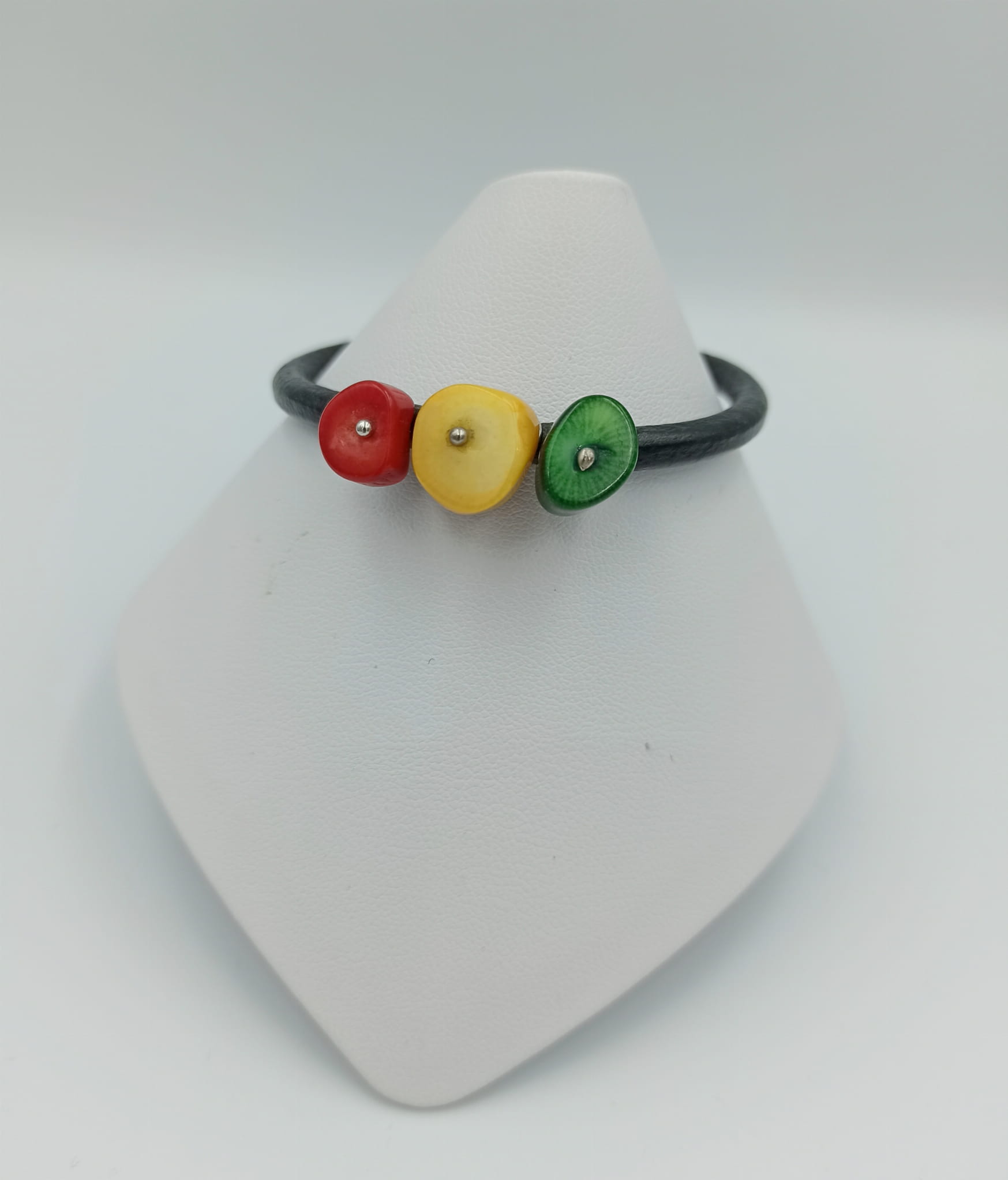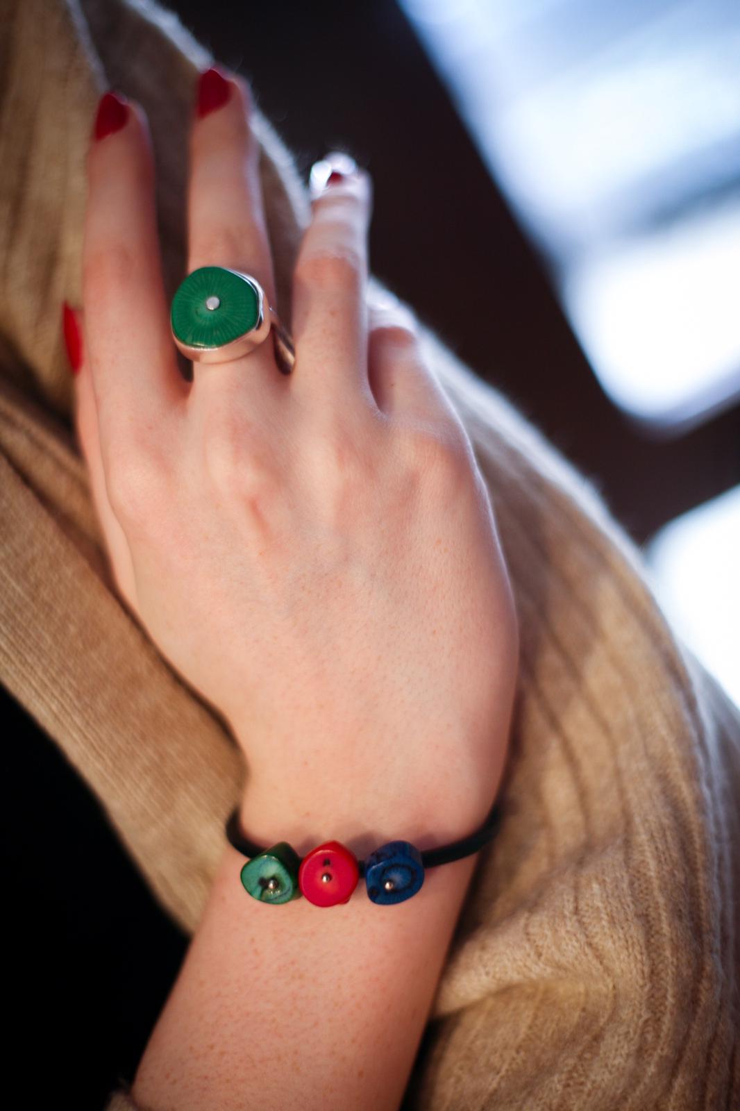 Bransoletka wykonana z kolorowych korali (czerwonych, zielonych i żółtych) oraz srebra pr. 925 na rzemienia w kolorze czarnym.
