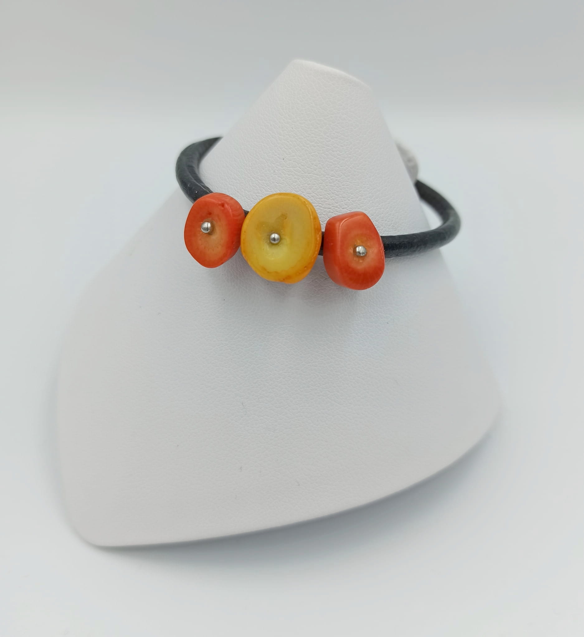 Bransoletka wykonana z kolorowych korali w odcieniach pomarańczu i żółci oraz srebra pr. 925 na rzemienia w kolorze czarnym.