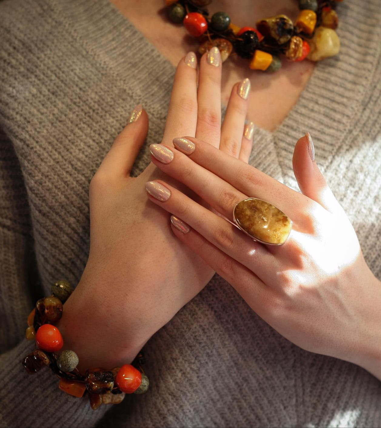 Ręcznie wykonana bransoletka Sieć Bursztynowa łączy w sobie naturalne bursztyny, korale w kolorze pomarańczowym i żółtym, kamienie w odcieniach zieleni (serpentynit,ryolit, koral zielony, turkus zielony). Wszystko połączone za pomocą złotej linki jubilerskiej i rzemienia w odcieniu brązu.