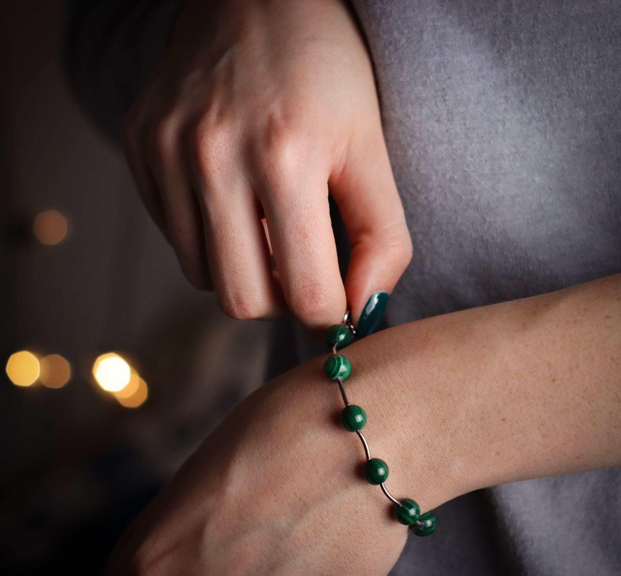 Bransoletka ręcznie wykonana z kuleczek malachitu oraz srebra pr.925