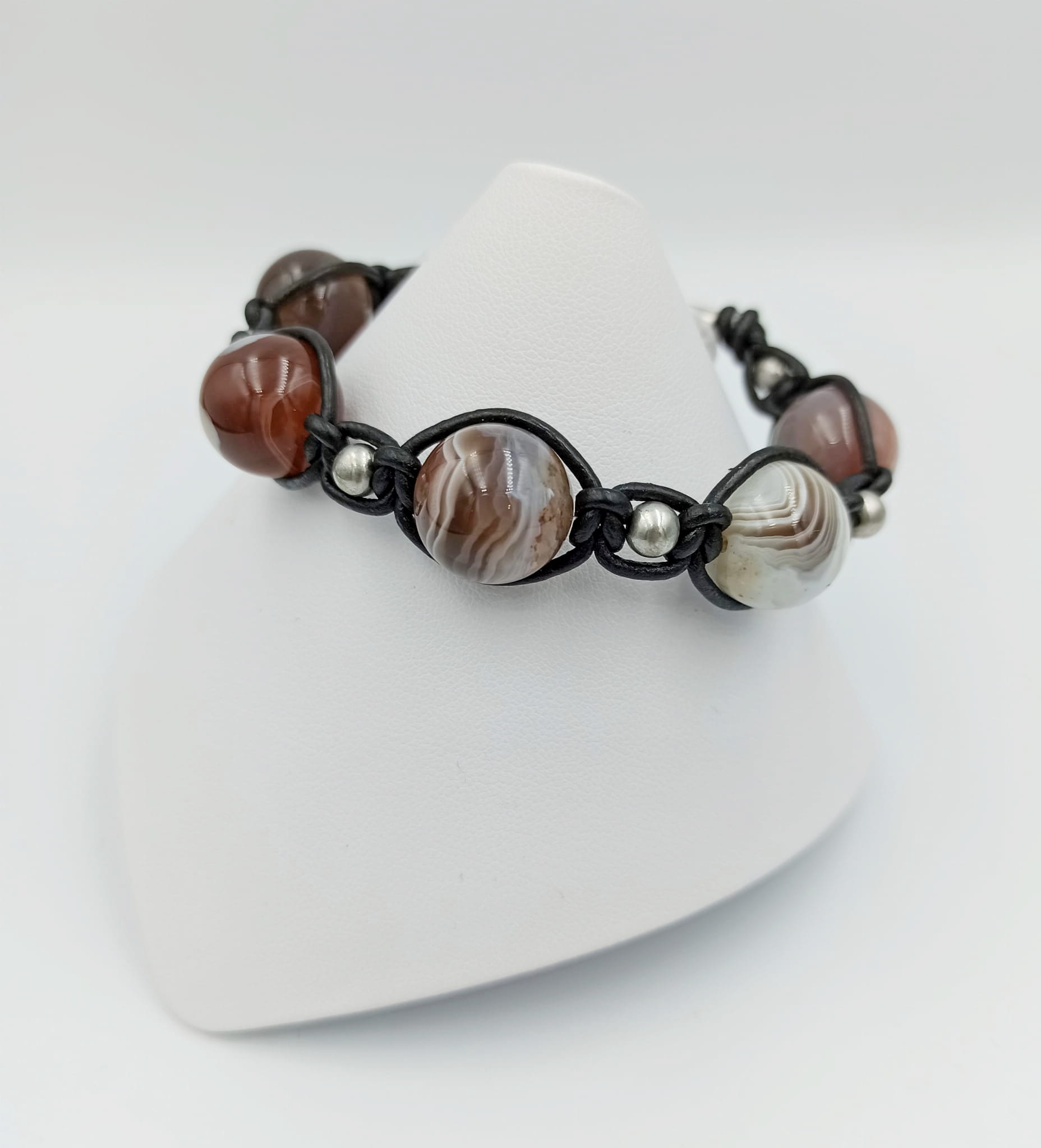 Bransoletka wykonana z bryłek agatu Botswana srebra pr.925 oraz rzemienia w kolorze czarnym.