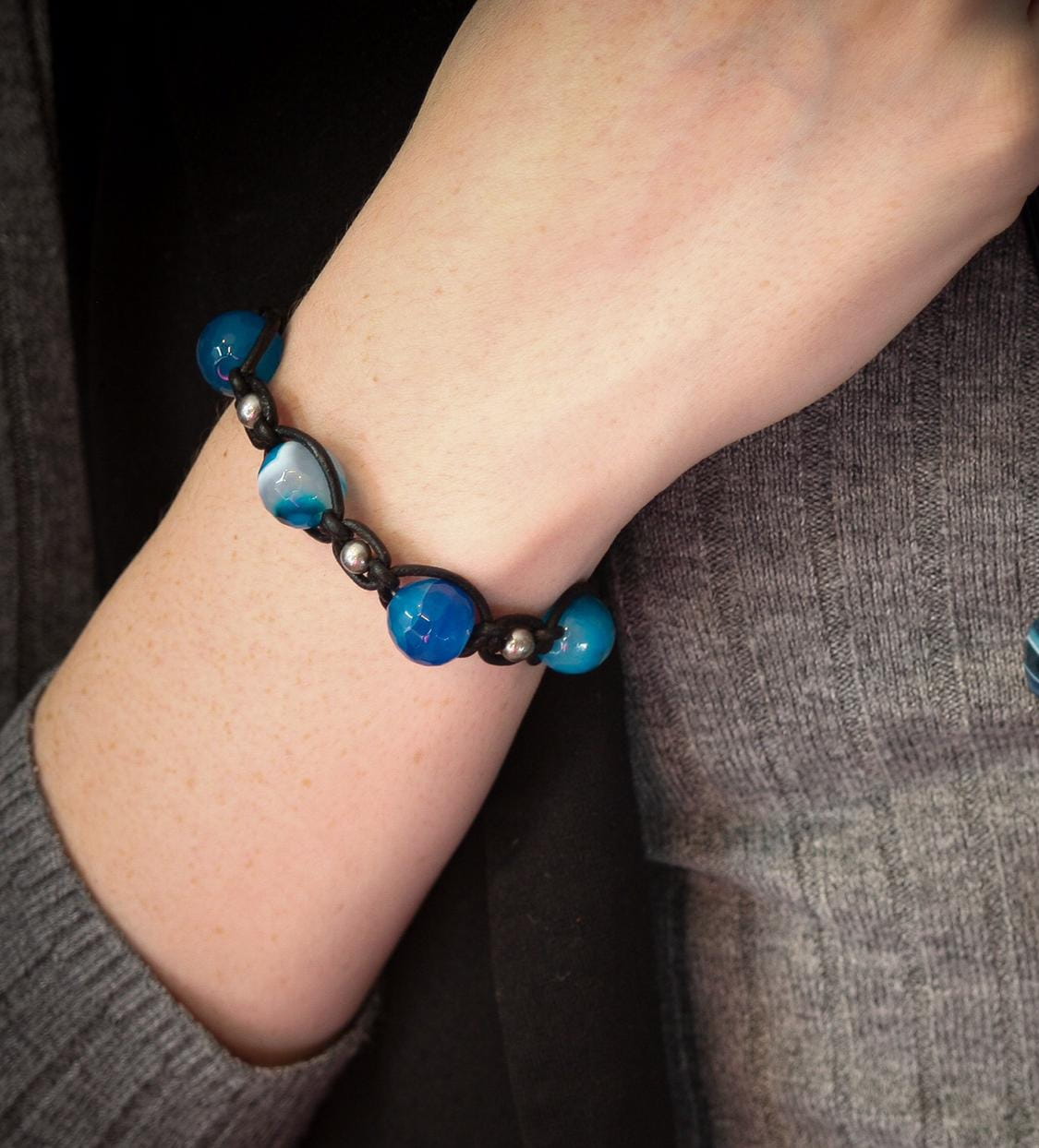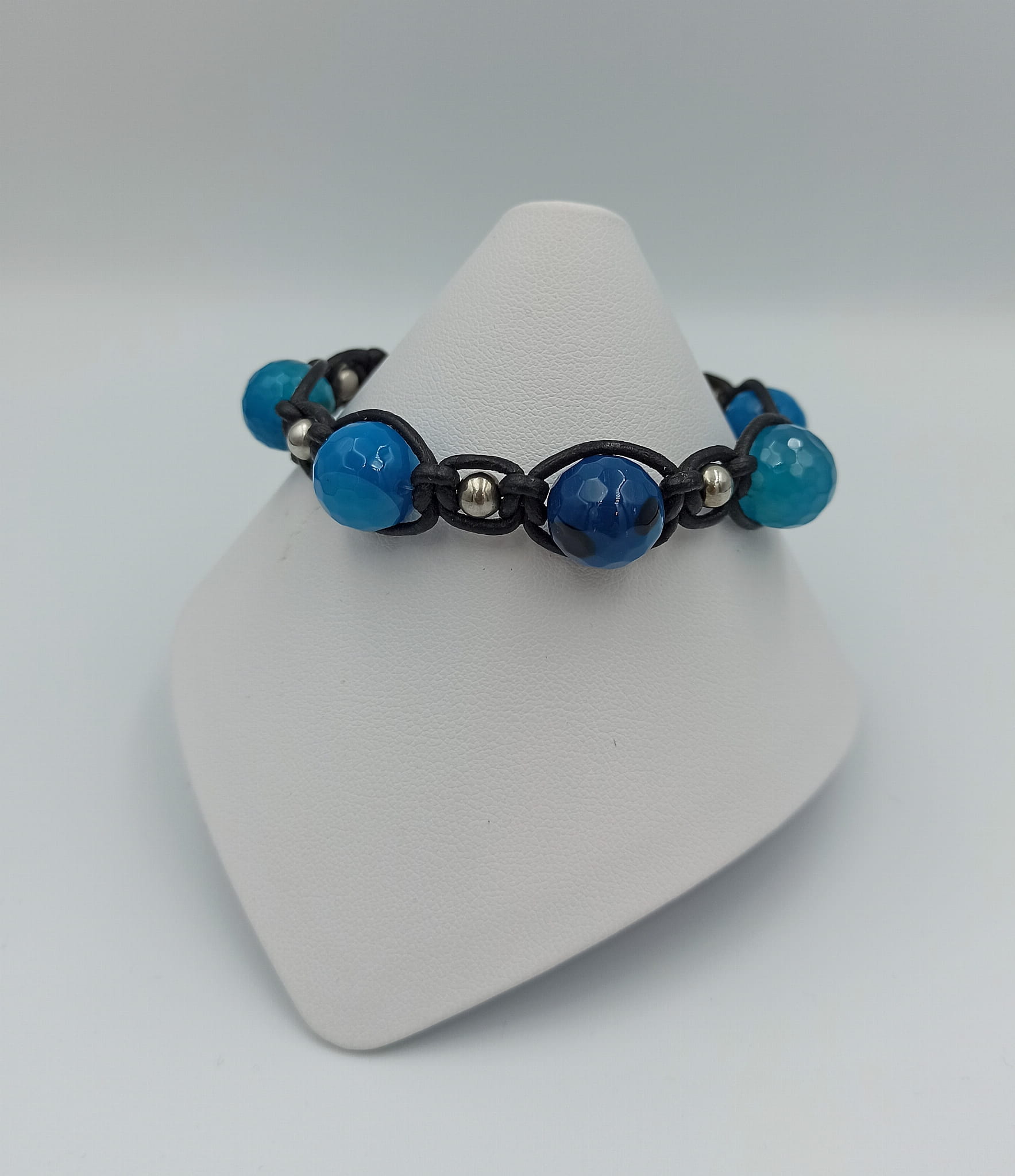 Bransoletka wykonana z fasetowanych kulek agatu niebieskiego oraz srebra pr. 925 przeplecionych rzemieniem w kolorze czarnym.