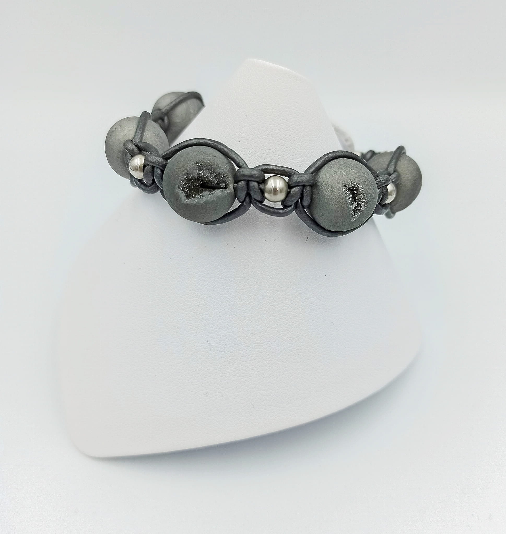 Bransoletka wykonana z tytanowanych kulek agatu szarego oraz srebra pr. 925 przeplecionych rzemieniem w kolorze grafitowym.