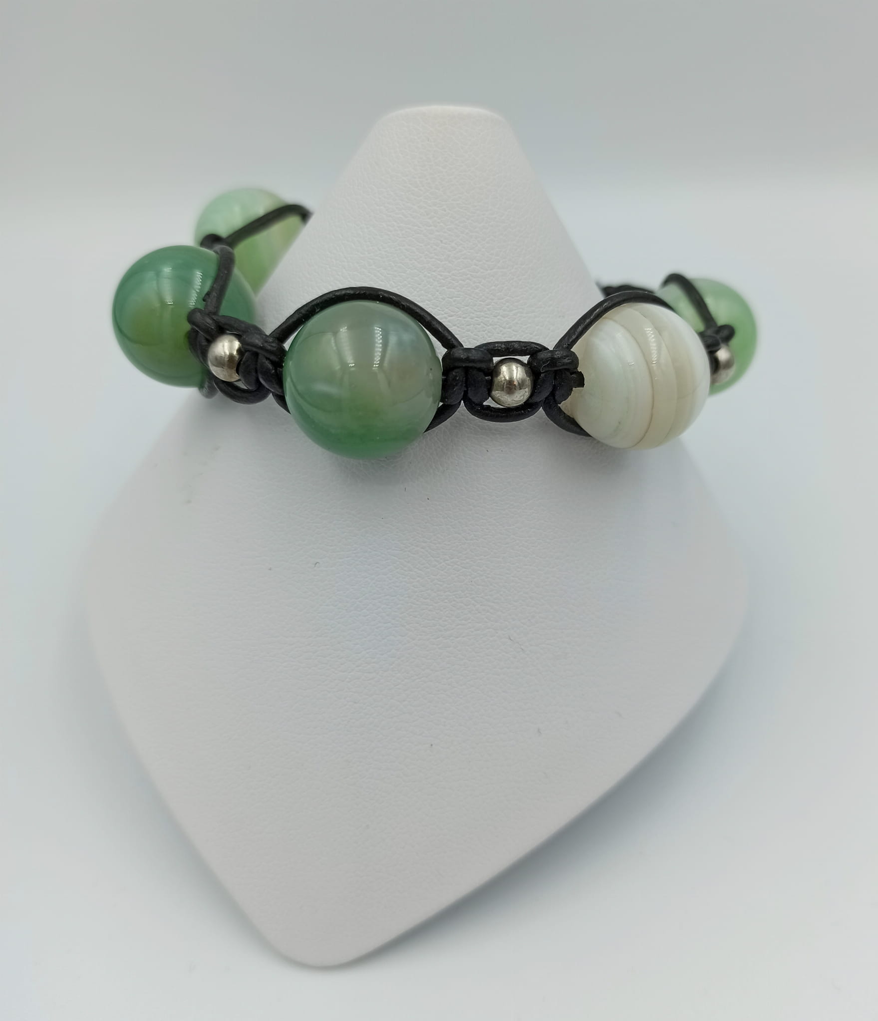Bransoletka wykonana ręcznie z kulek jasnozielonego agatu oraz srebra pr. 925 przeplecionych rzemieniem w kolorze czarnym.