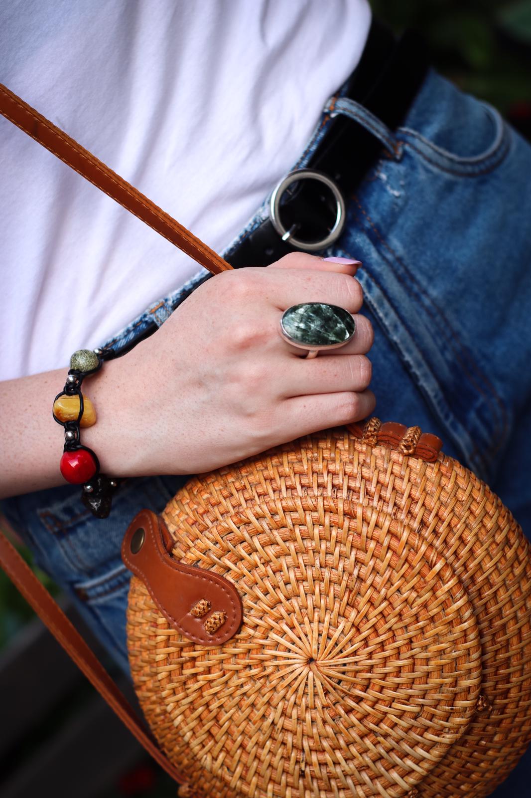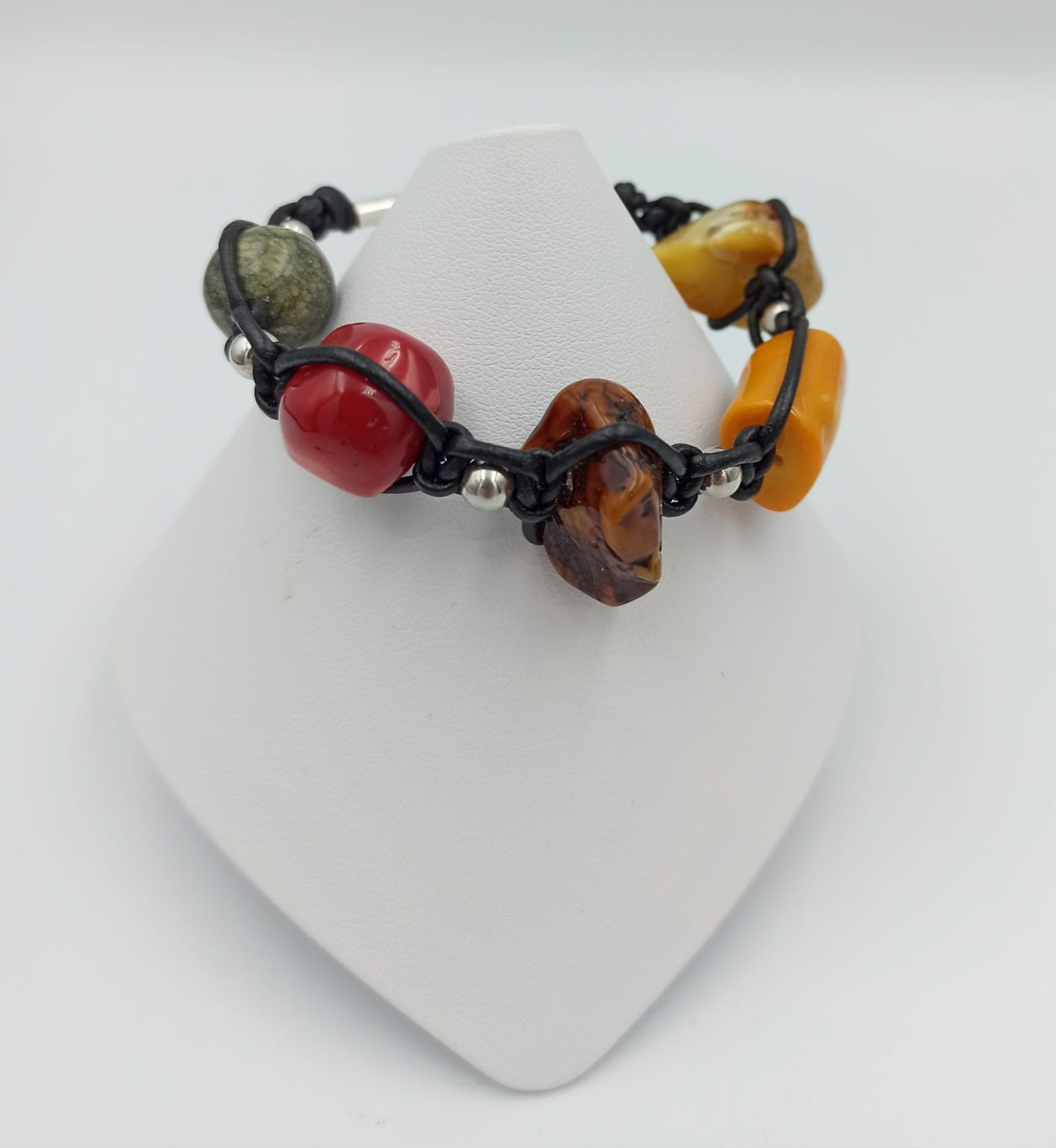 Bransoletka wykonana ręcznie z naturalnego bursztynu, zielonych jaspisów (unakit lub serpentynit), kolorowych korali (czerwonych i żółtych) oraz srebra pr. 925, przeplecionych rzemieniem w kolorze czarnym.