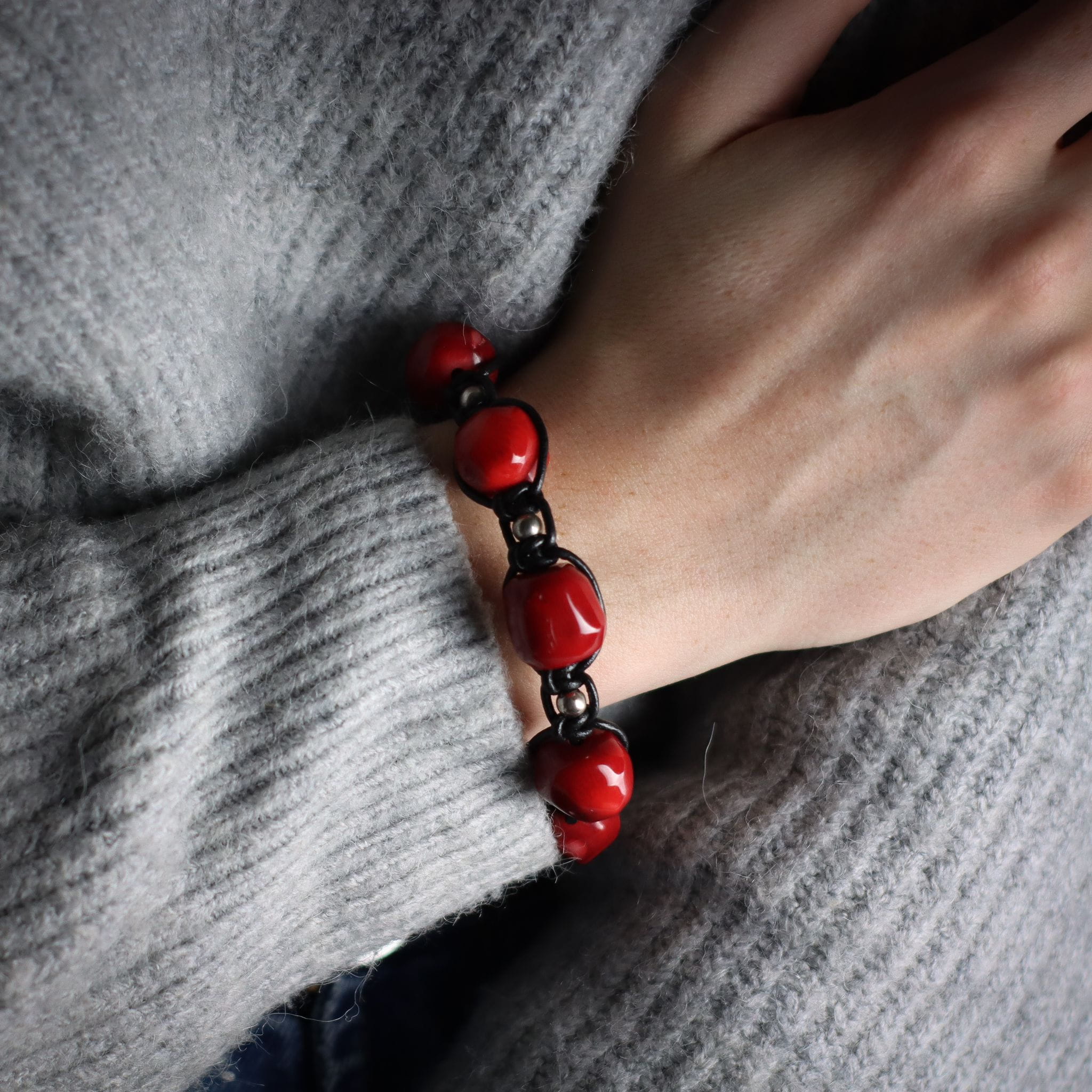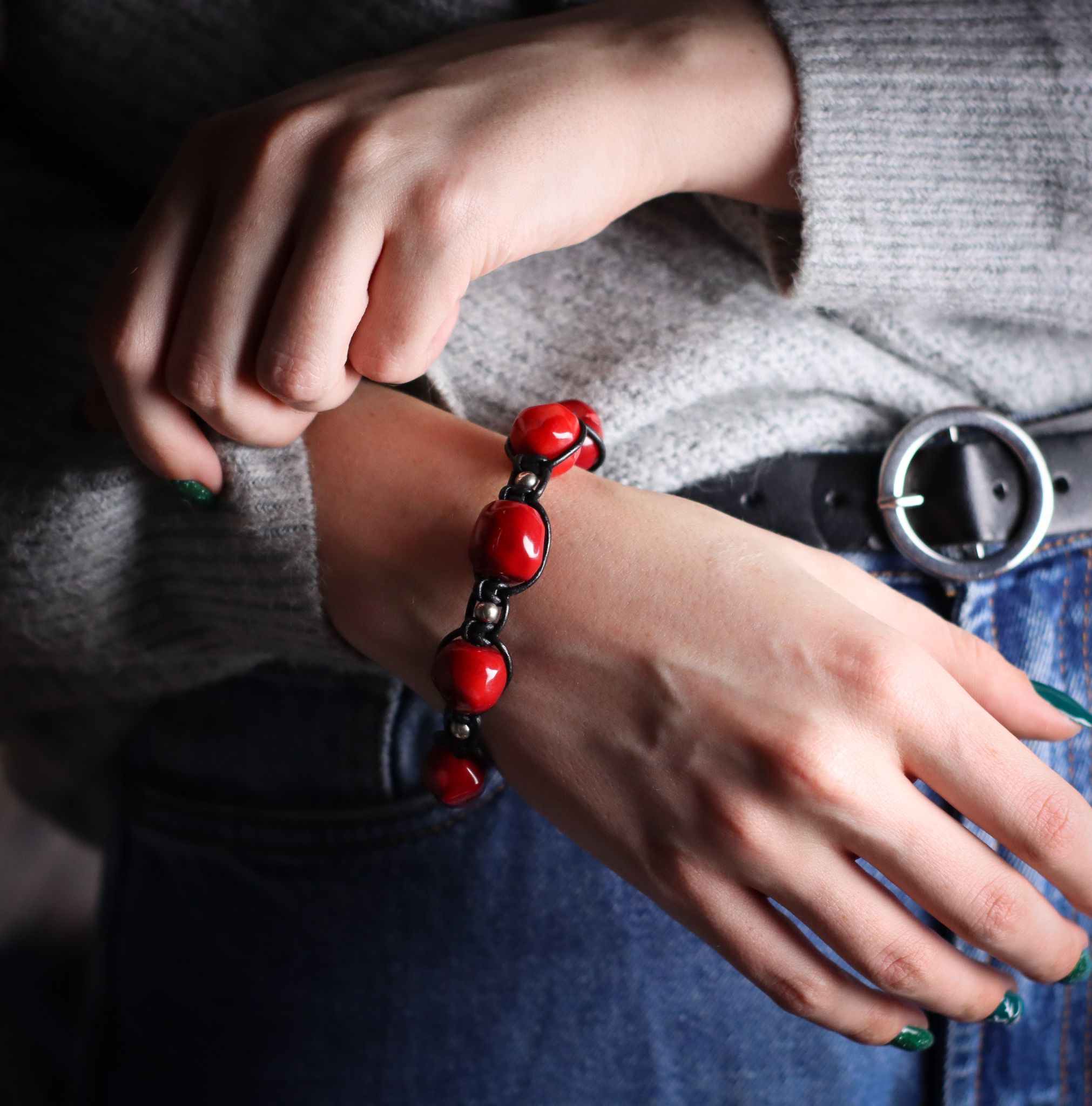Bransoletka wykonana z korali czerwonych w kształcie bryłek oraz srebra pr. 925 przeplecionych rzemieniem w kolorze czarnym.