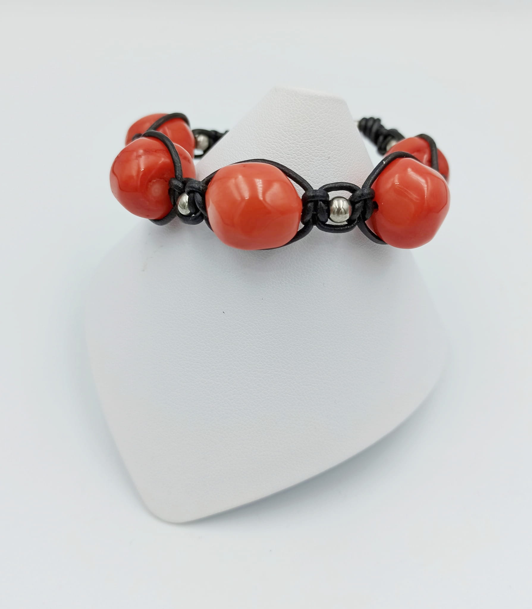 Bransoletka wykonana z korali pomarańczowych w kształcie bryłek oraz srebra pr. 925 przeplecionych rzemieniem w kolorze czarnym.