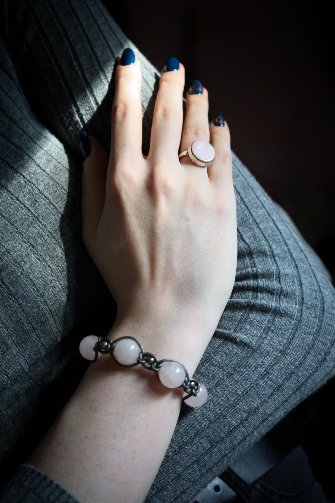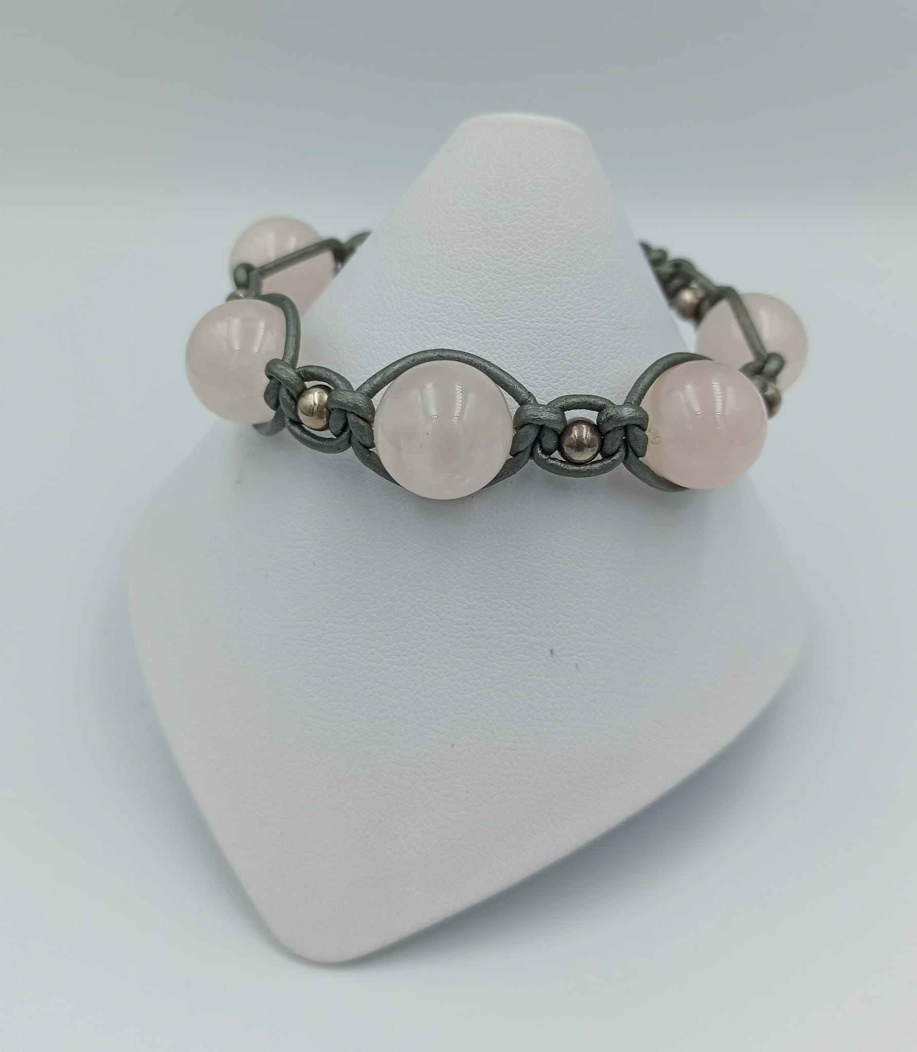 Bransoletka wykonana z kulek kwarcu różowego oraz srebra pr. 925 przeplecionych rzemieniem w kolorze grafitowym.