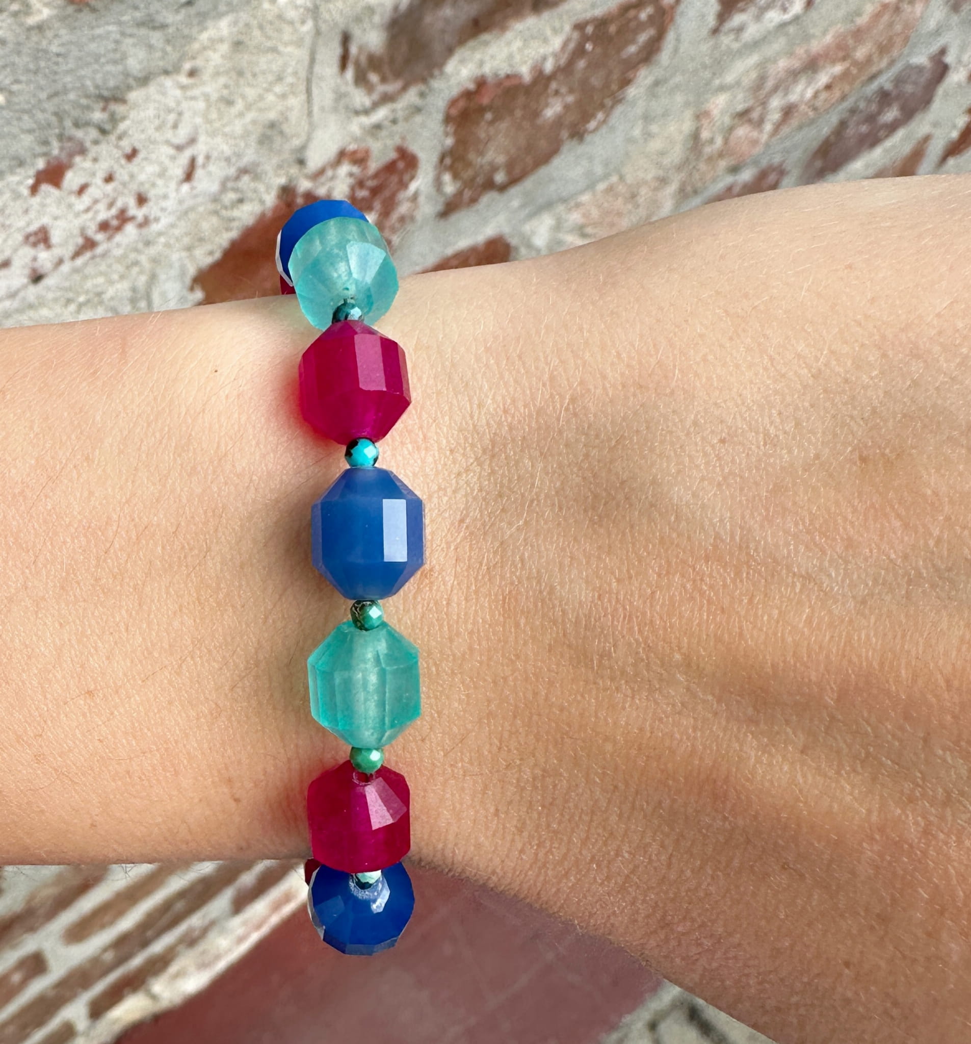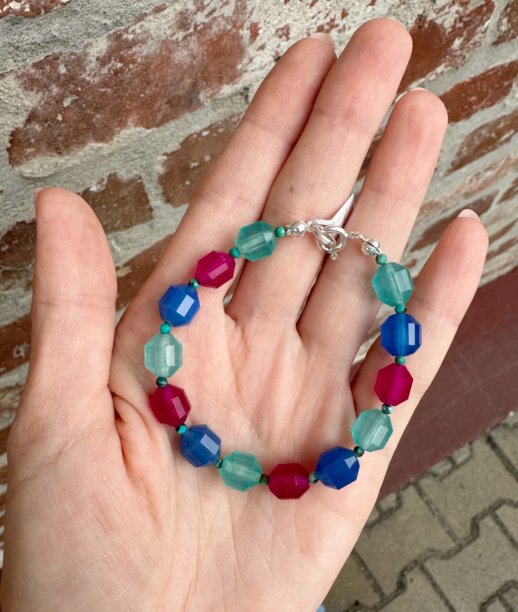 Bransoletka ręcznie wykonana z fasetowanych agatów w kolorze kobaltu, fuksji oraz mięty, drobnych fasetowanych turkusów oraz srebra pr.925