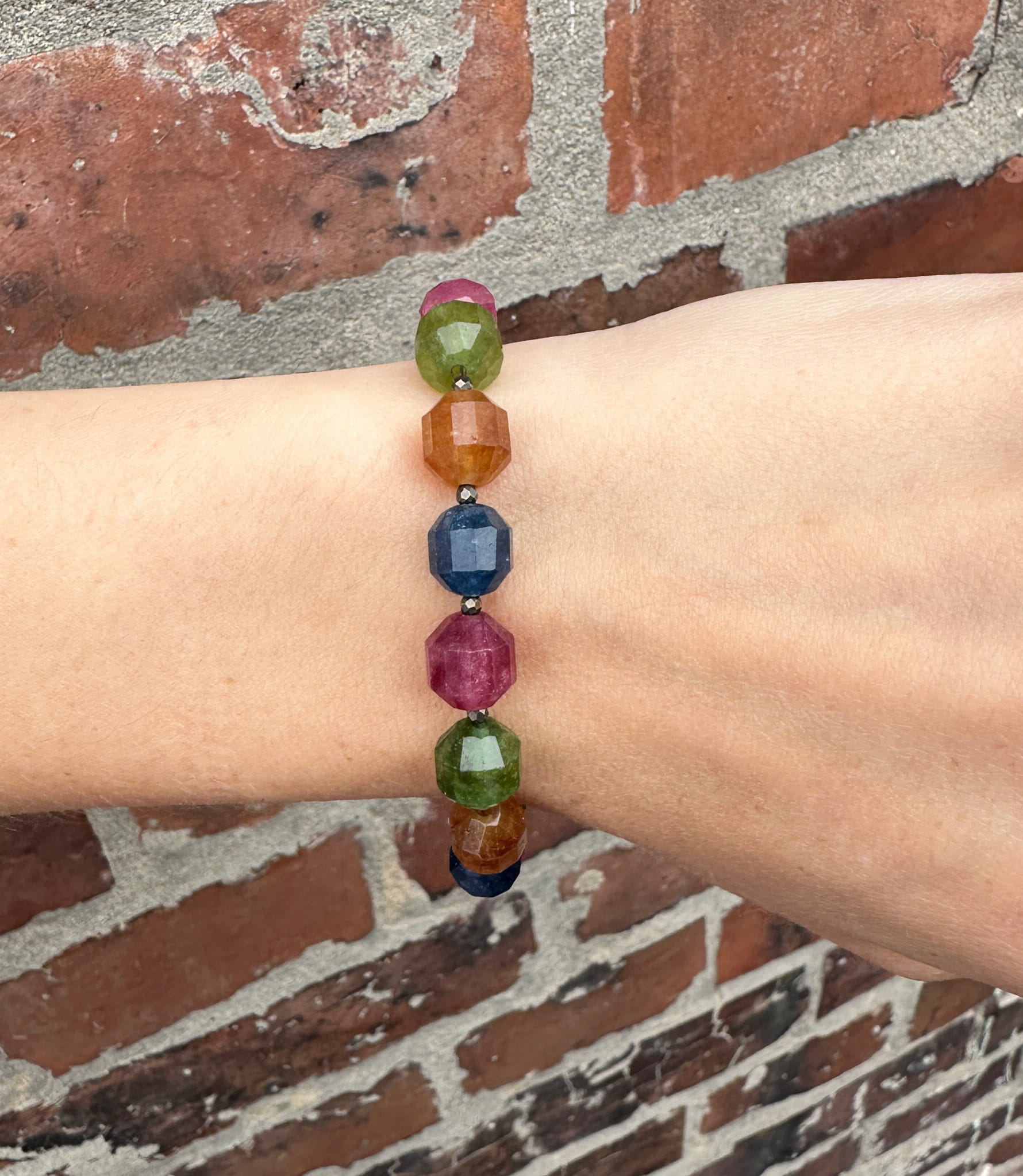 Bransoletka ręcznie wykonana z fasetowanych jadeitów kolorowych, drobnych fasetowanych pirytów oraz srebra pr.925