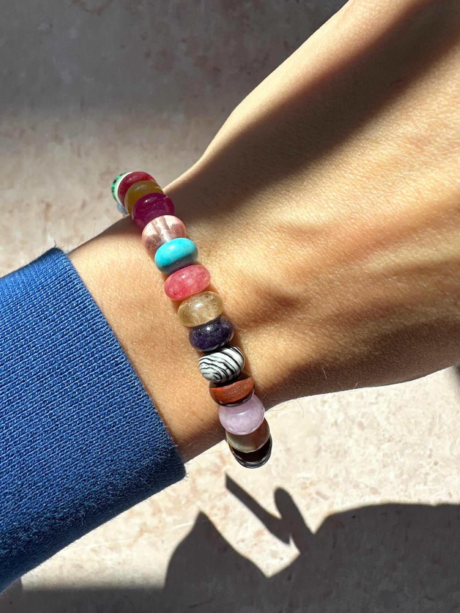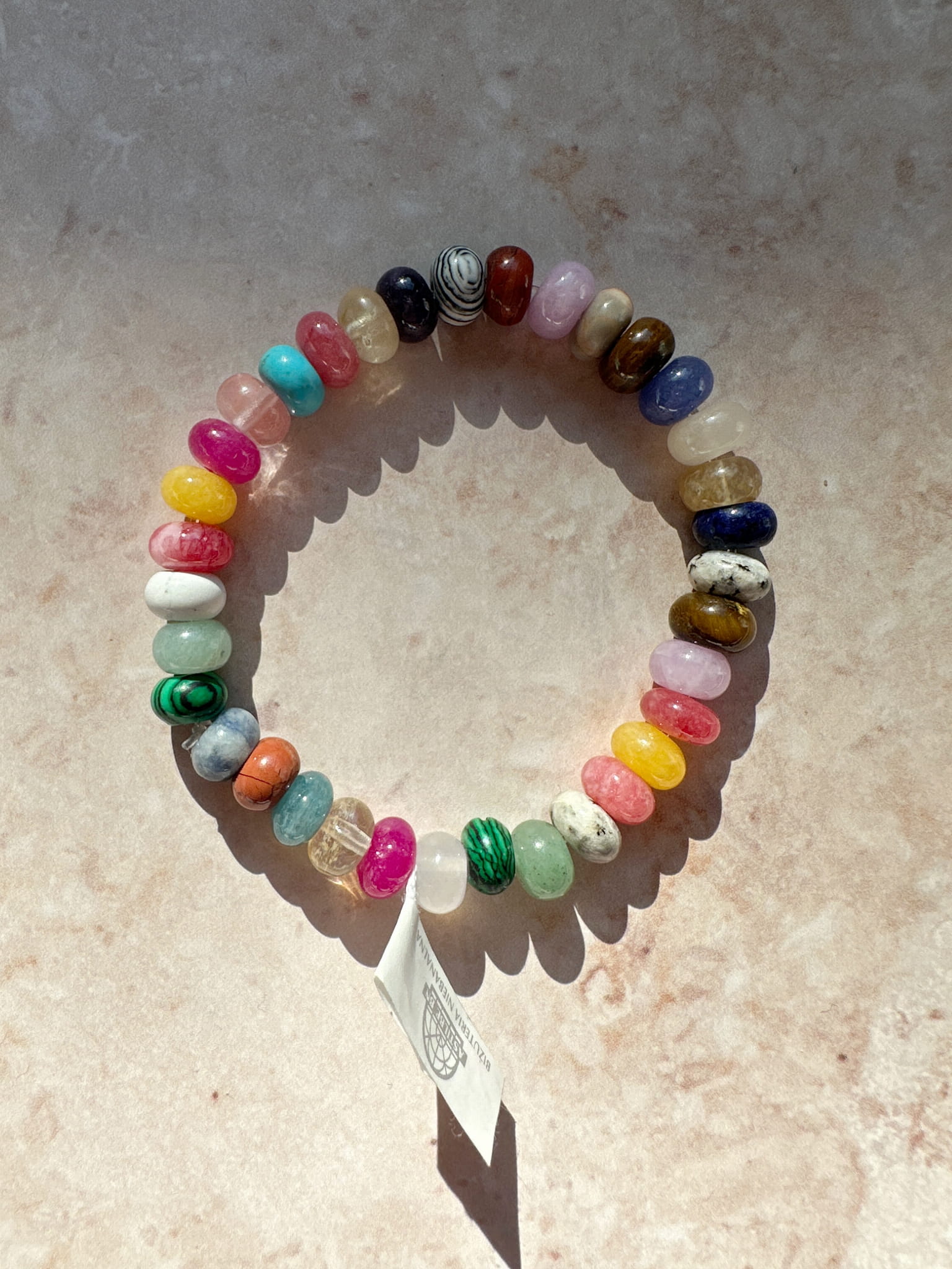 Bransoletka ręcznie wykonana z kolorowych kamieni półszlachetnych głównie agatow i jadeitów na gumce