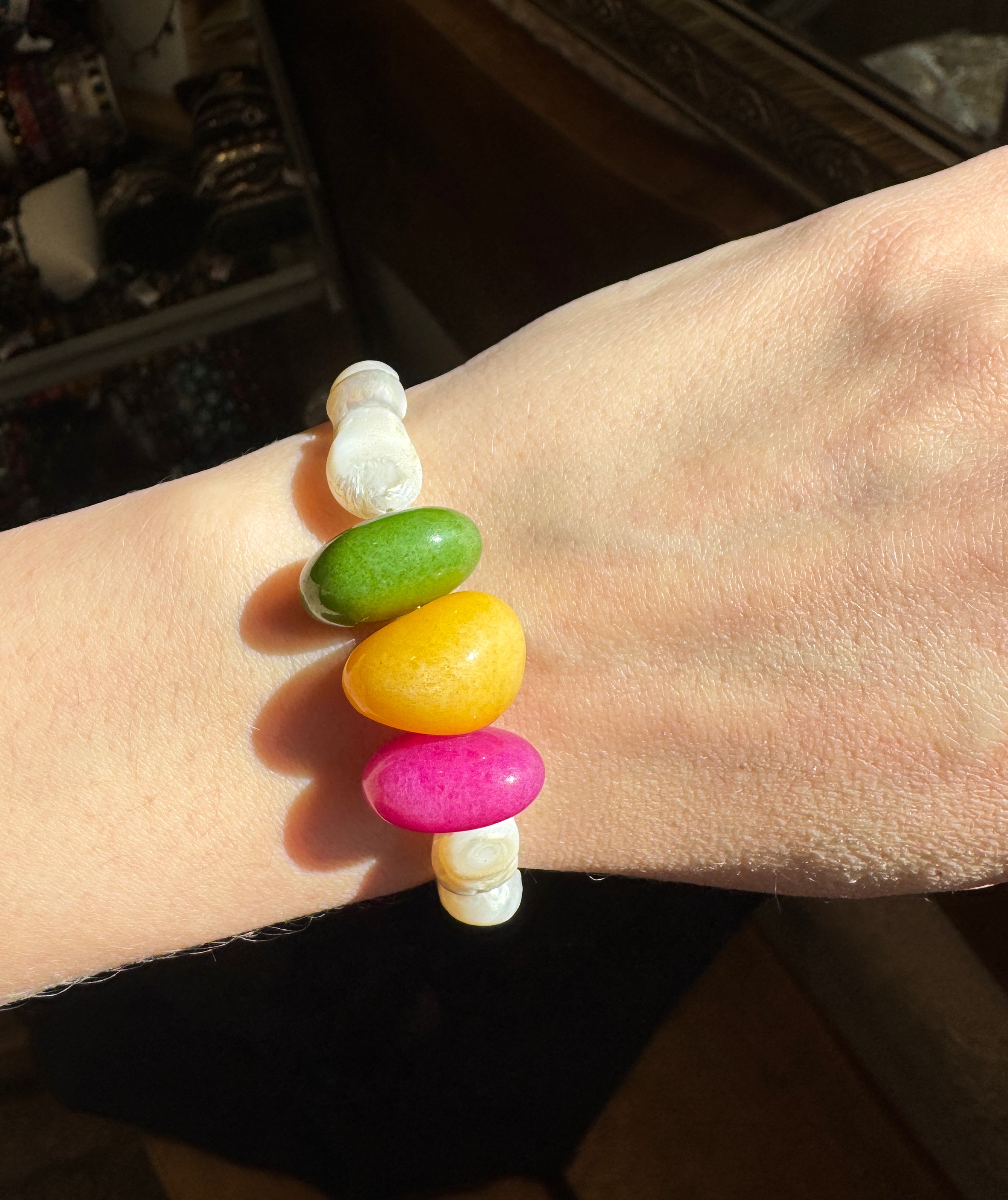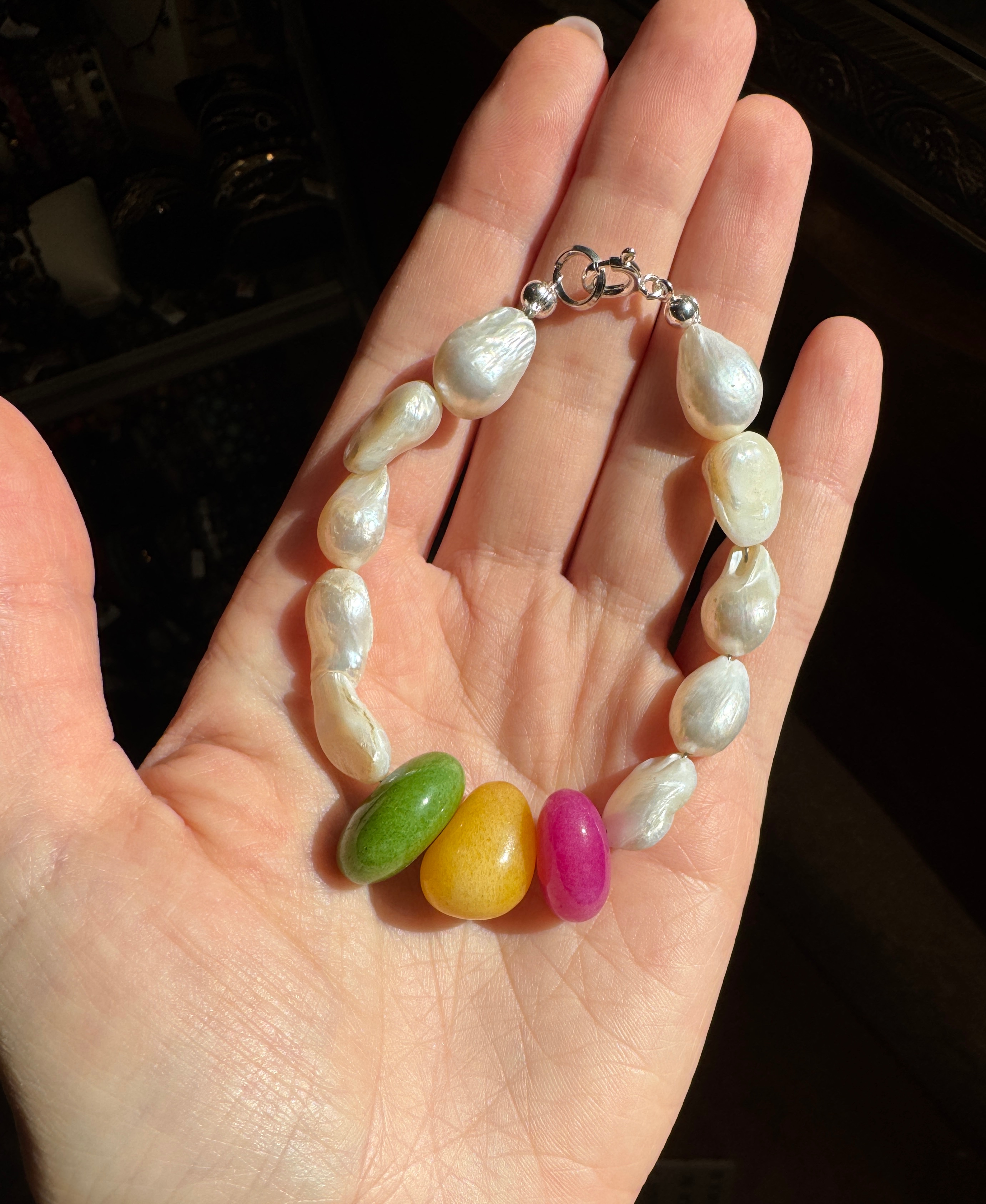 Ręcznie wykonana bransoletka Radość z naturalnych pereł hodowanych, pięknych kolorowych jadeitow oraz srebra pr.925.