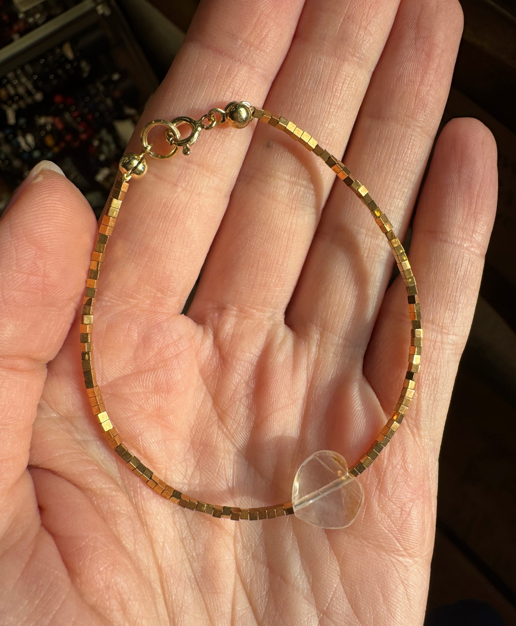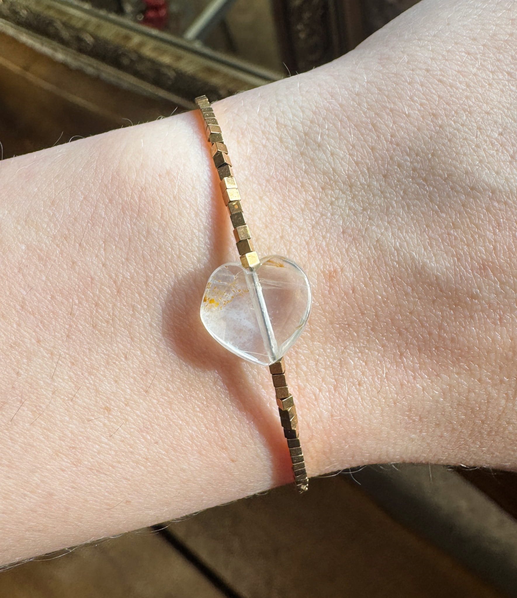 Delikatna bransoletka Serce z kwarcu z rutylem fasetowanego, złotym hematytem oraz zapięciem ze złoconego srebra pr.925