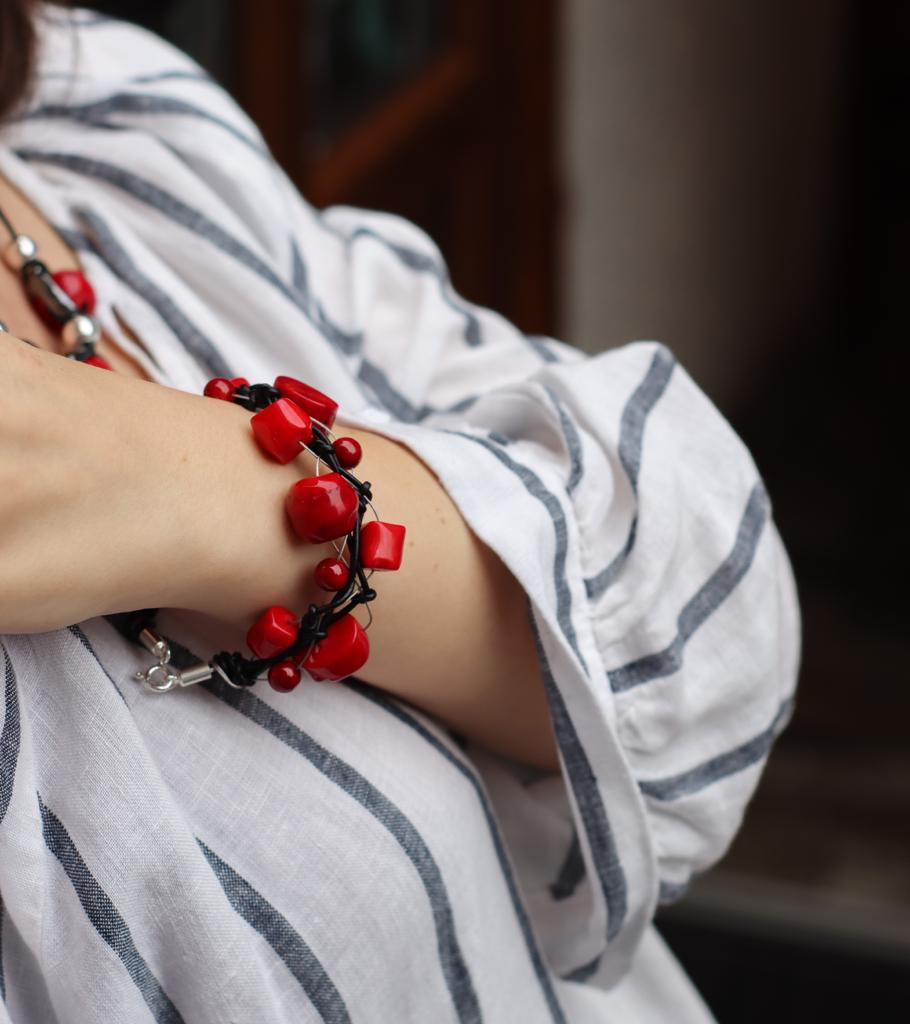 Bransoletka Sieć Exclusive wykonana jest z korali czerwonych zaplecionych na srebrnej lince jubilerskiej i czarnym rzemieniu.