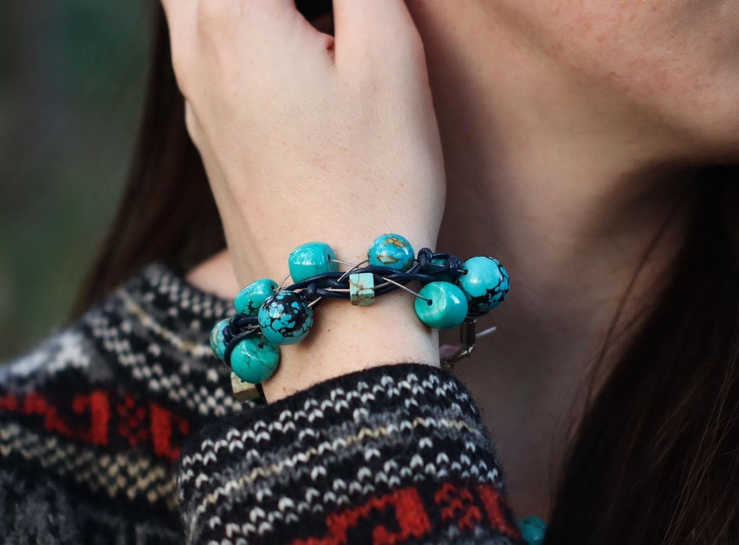 Bransoletka Sieć Exclusive wykonana jest z turkmenitów zaplecionych na srebrnej lince jubilerskiej i granatowym rzemieniu.