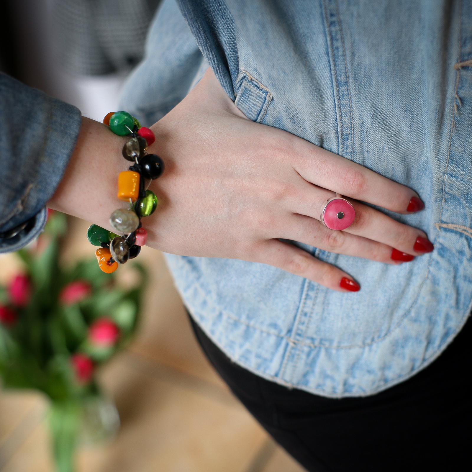 Bransoletka Sieć Klasyczna Wiosenna wykonana jest z kamieni półszlachetnych (koral żółty i różowy, onyks, agat zielony) i szkła weneckiego. Wszystko zaplecione na srebrnej lince jubilerskiej i cienkim czarnym sznurku.