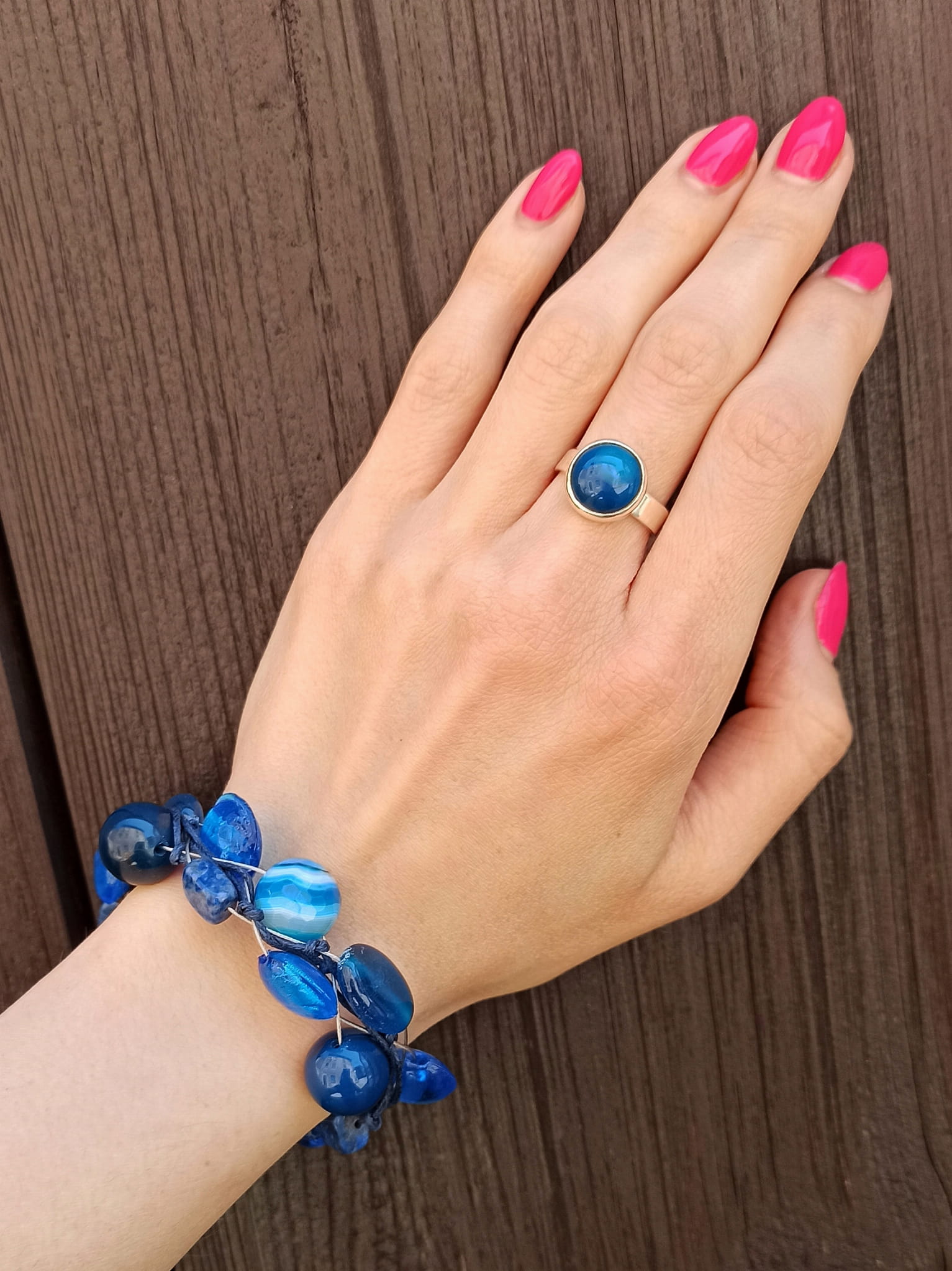 Bransoletka Sieć Klasyczna w kolorze niebieskim wykonana jest z kamieni półszlachetnych (lapis lazuli, sodalit, koral niebieski, agat, jadeit) i szkła weneckiego. Wszystko zaplecione na srebrnej lince jubilerskiej i cienkim ciemnoniebieskim sznurku.