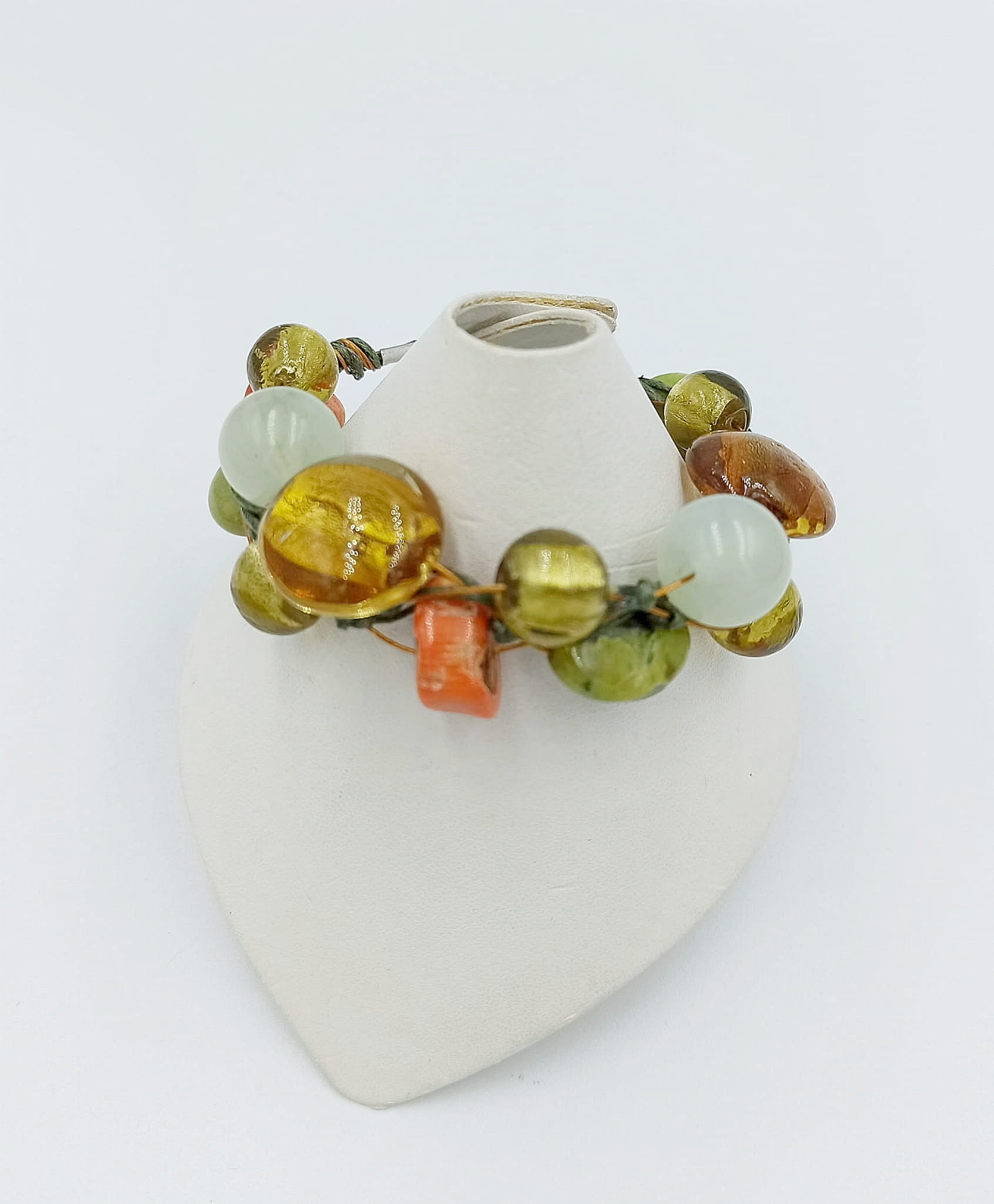 Bransoletka Sieć Klasyczna oliwkowo-pomarańczowa wykonana jest z kamieni półszlachetnych (koral pomarańczowy, serpentynit, ryolit, jadeit, agat) i szkła weneckiego. Wszystko zaplecione na złotej lince jubilerskiej i cienkim oliwkowozielonym sznurku.
