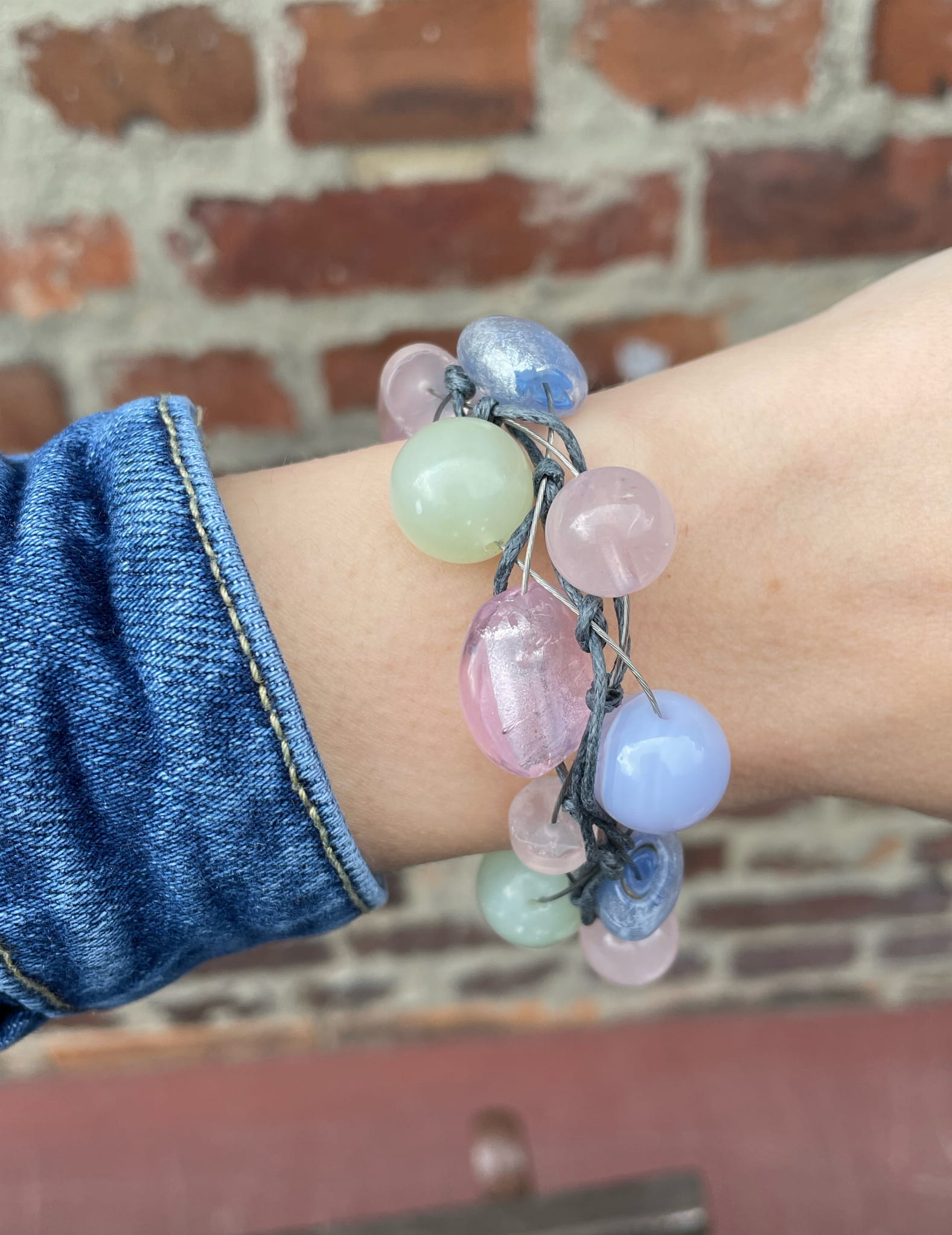 Bransoletka Sieć Klasyczna w odcieniach zieleni, różu i błękitu wykonana ręcznie w naszej pracowni przez Karinę.