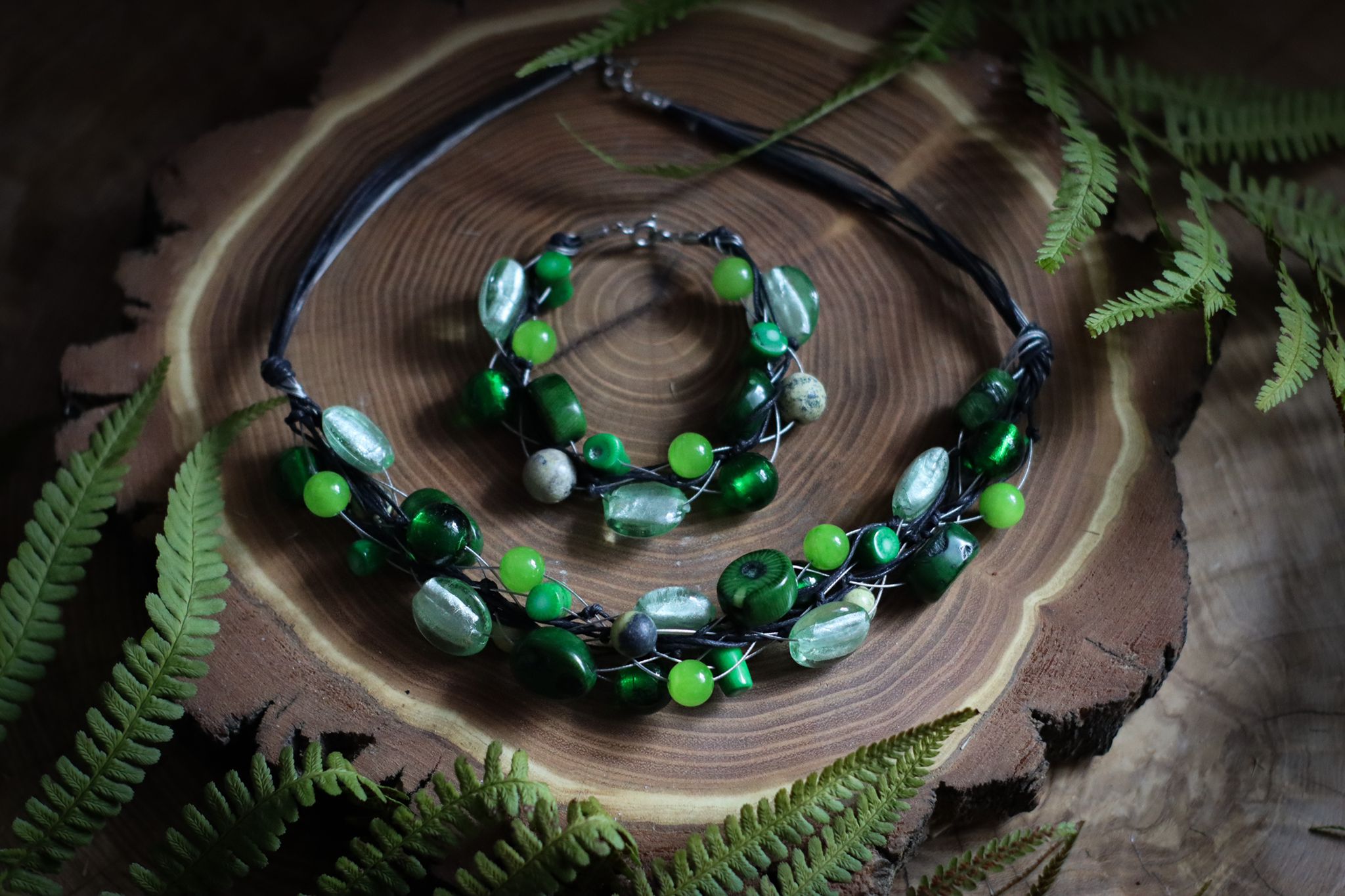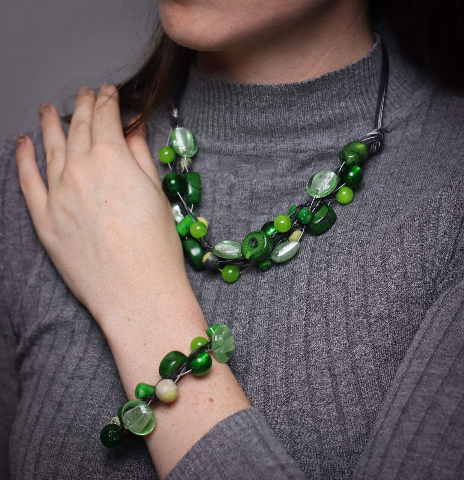 Bransoletka Sieć Klasyczna w odcieniach zieleni wykonana jest z kamieni półszlachetnych (agat, jadeit, koral zielony, malachit) i szkła weneckiego. Wszystko zaplecione na srebrnej lince jubilerskiej i cienkim czarnym sznurku.