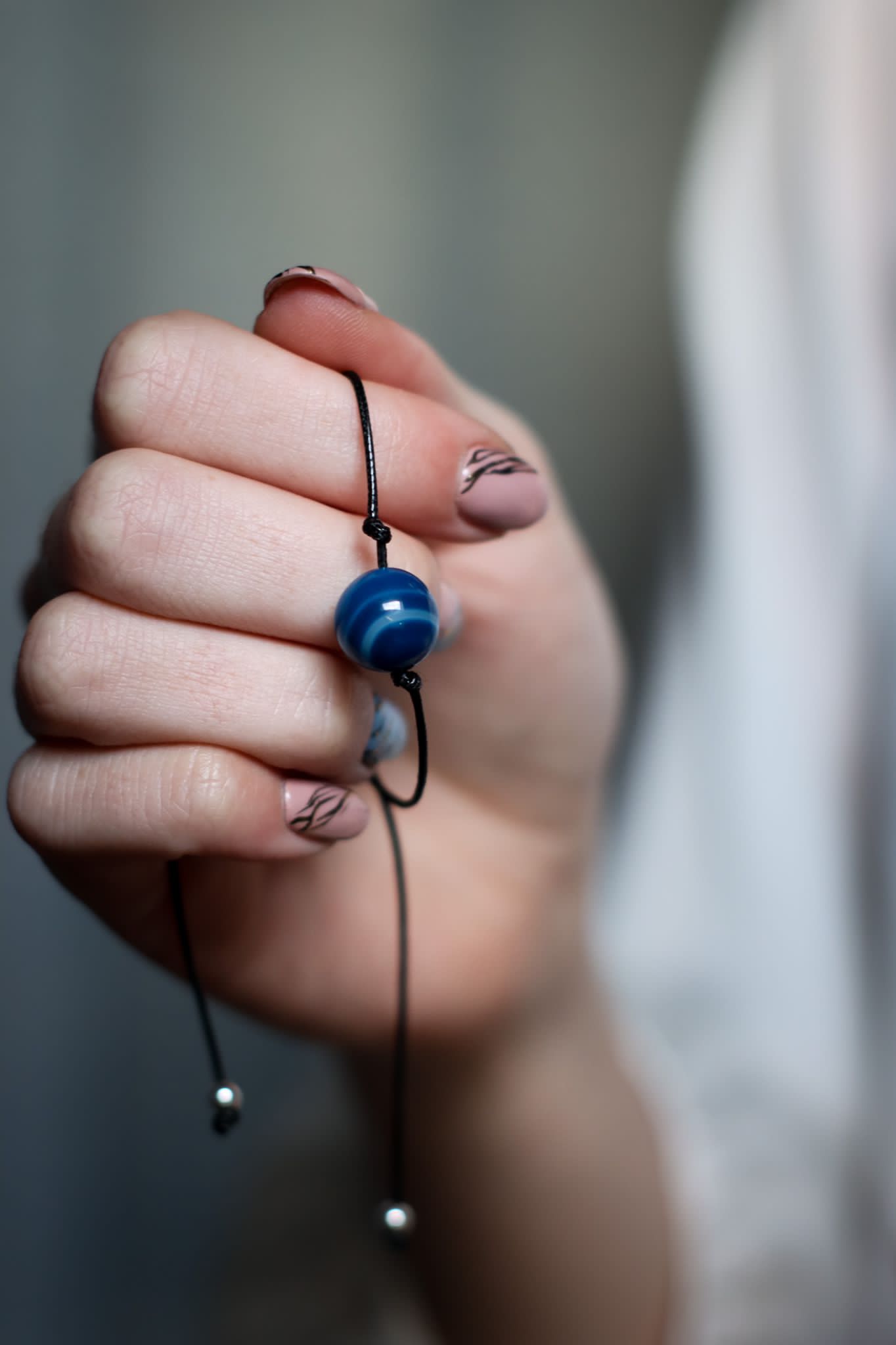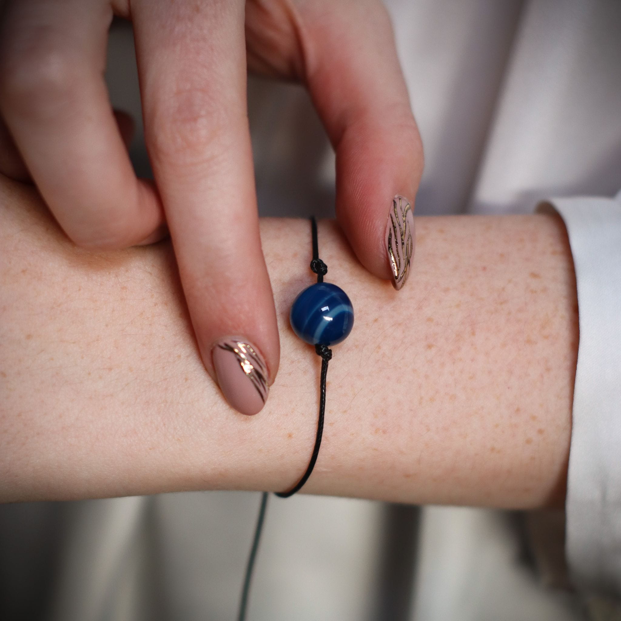 Piękna, delikatna i subtelna bransoletka z kulki agatu niebieskiego na czarnym sznurku.