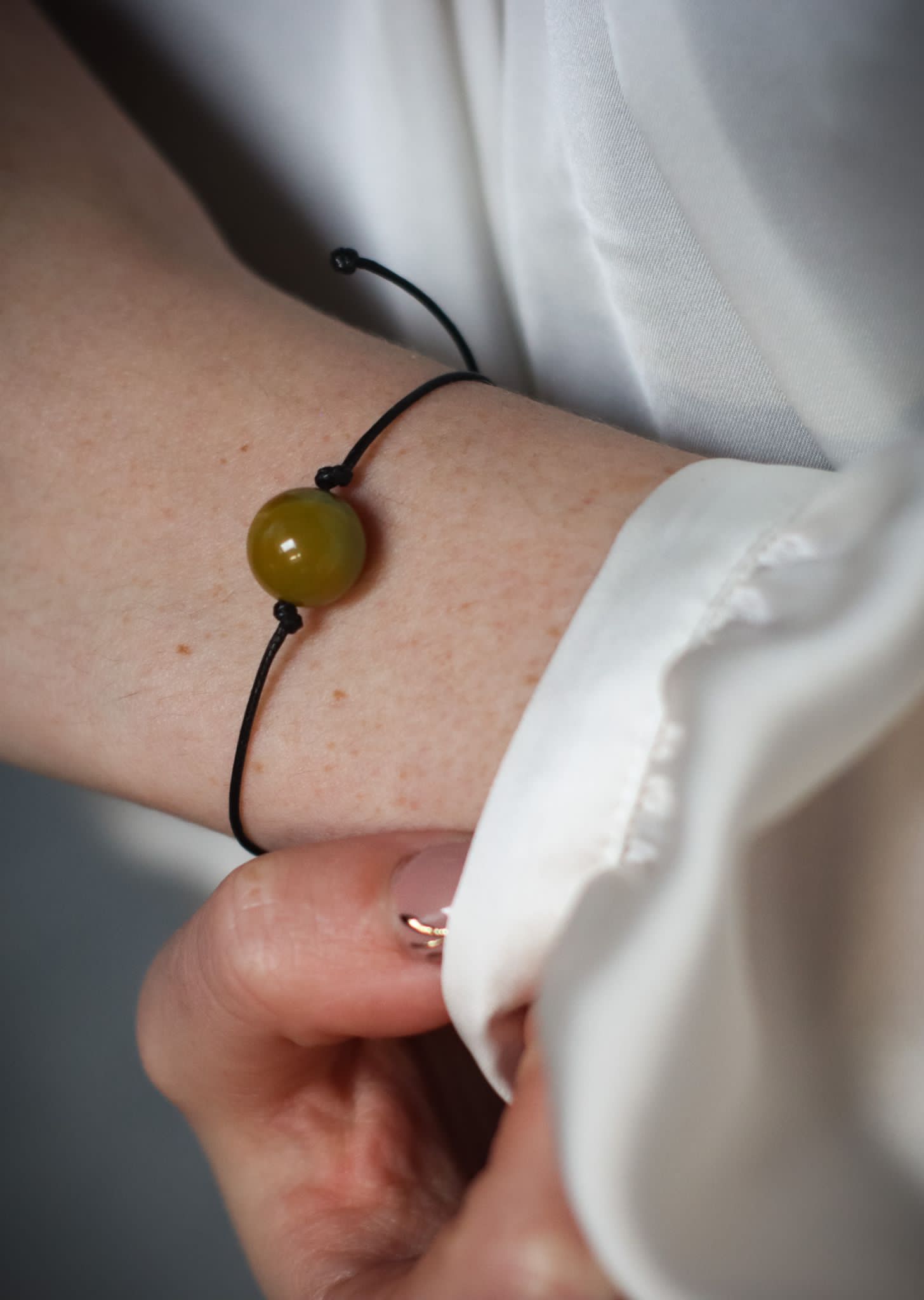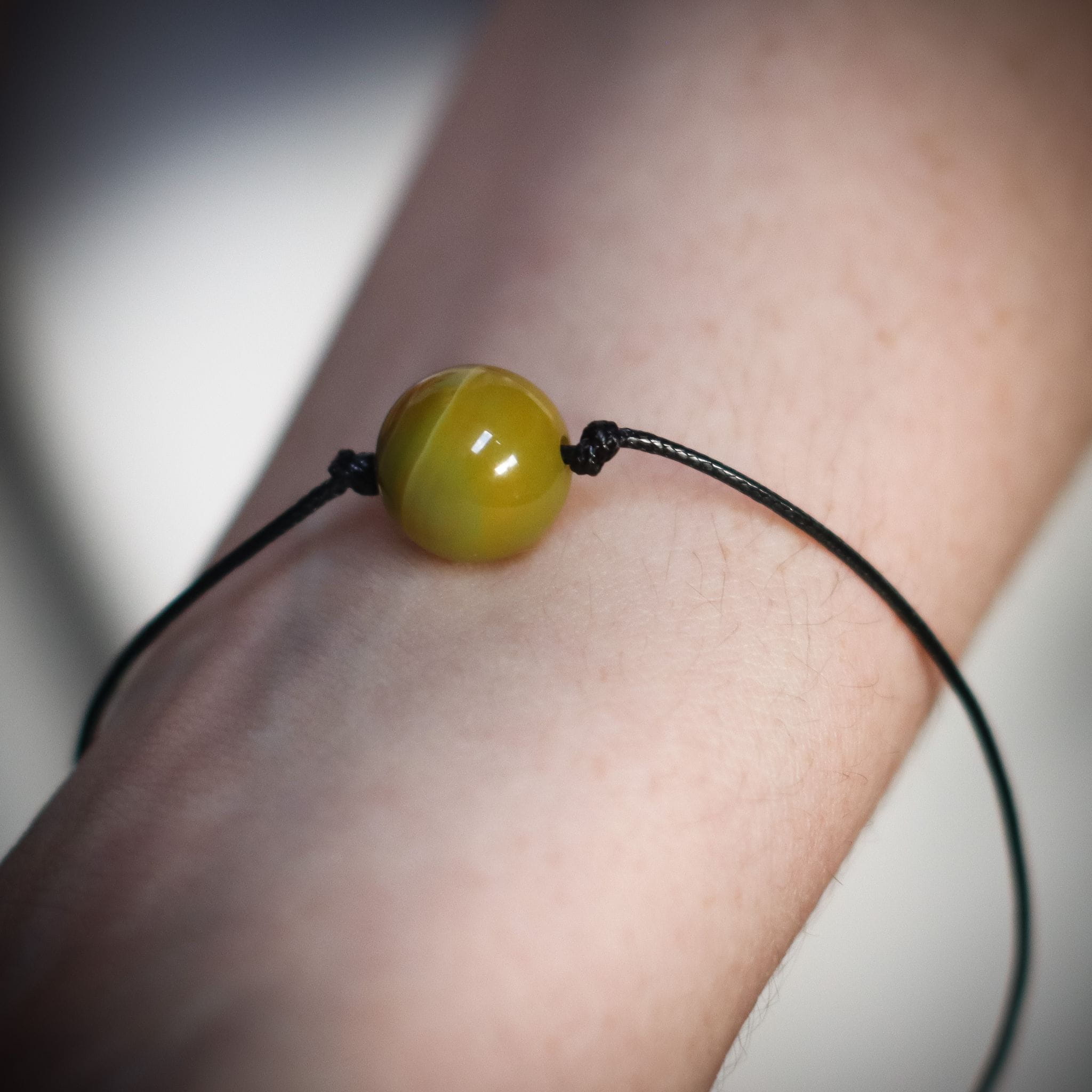 Piękna, delikatna i subtelna bransoletka z kulki agatu żółtego na czarnym sznurku.