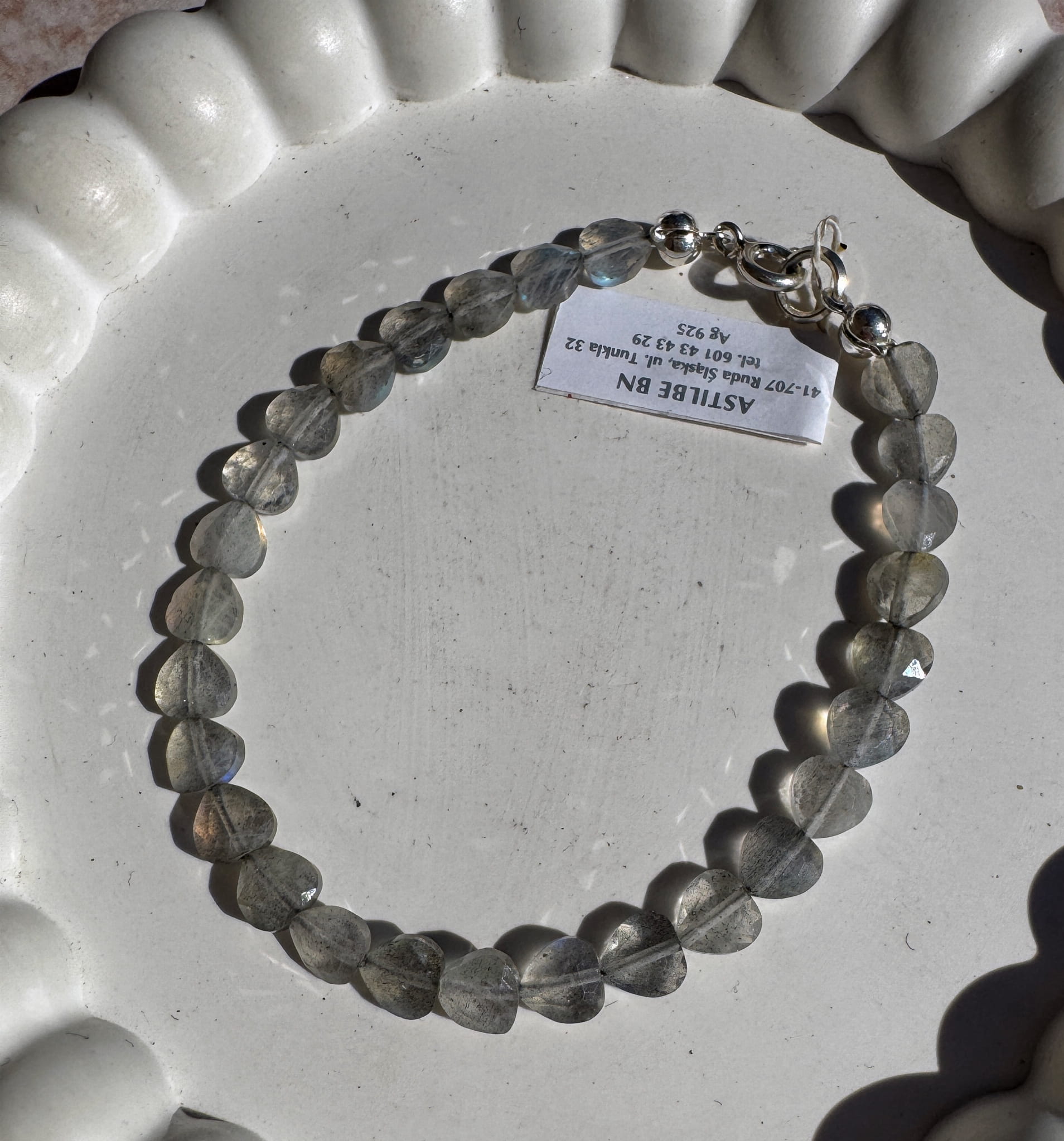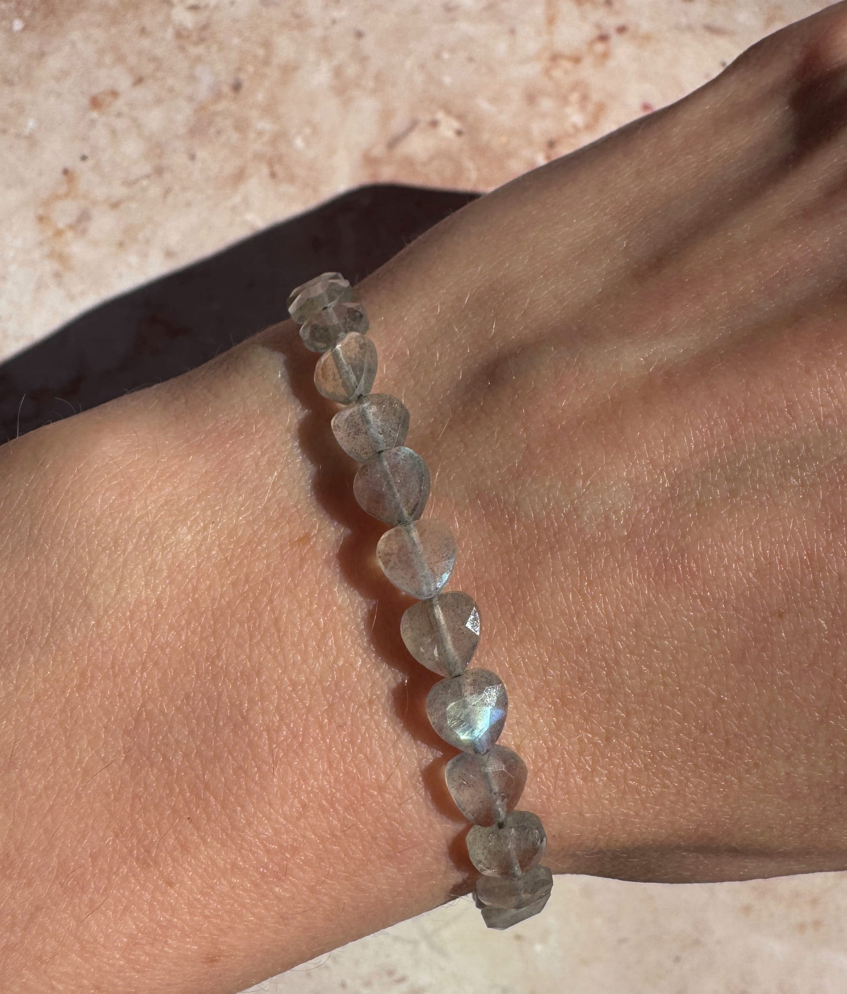 Piękna, delikatna bransoletka w której znajdziesz fasetowany labradoryt w kształcie serc.