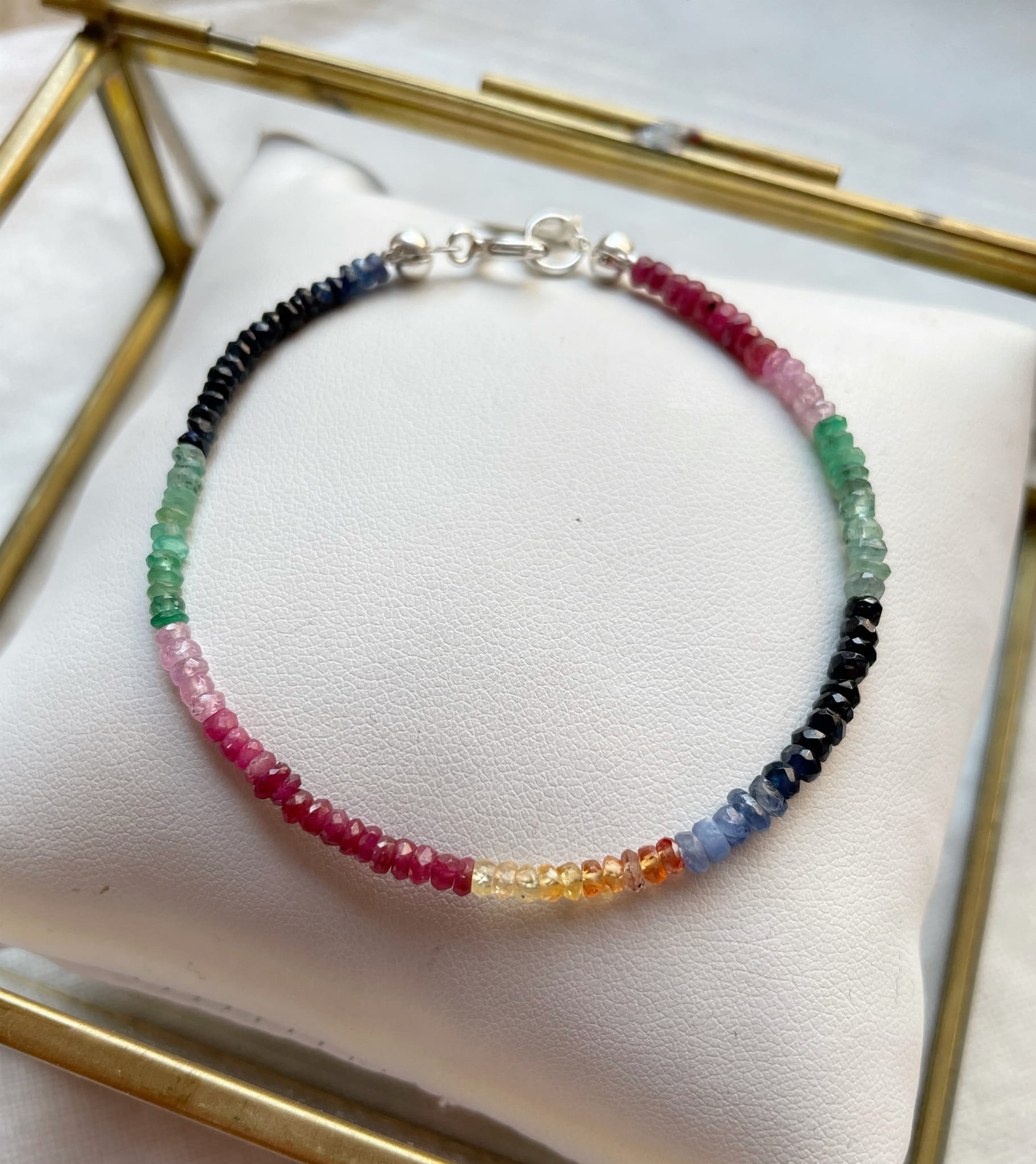 Piękna, kolorowa, delikatna bransoletka z szafirów, rubinów i szmaragdów fasetowanych.