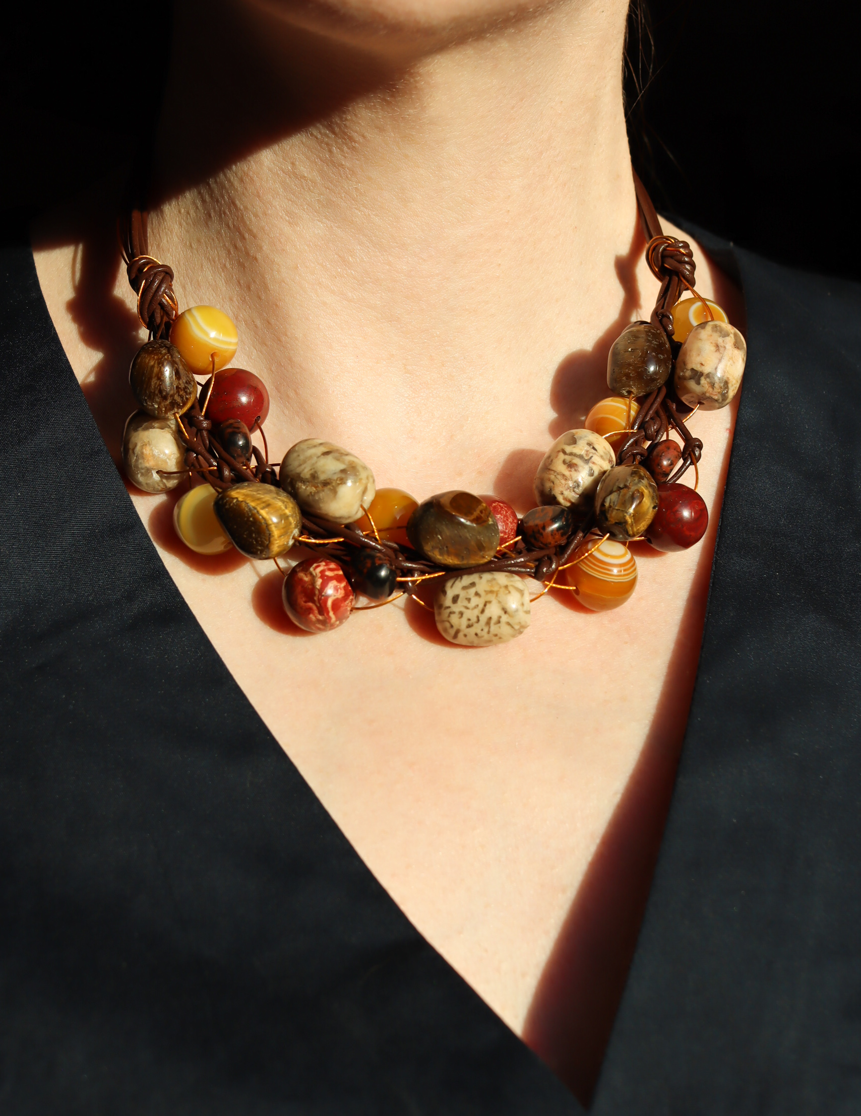 Sieć Exclusive kamieni w odcieniach brązu (głównie jaspisy i agaty), linki jubilerskiej i rzemienia w brązowym kolorze.
