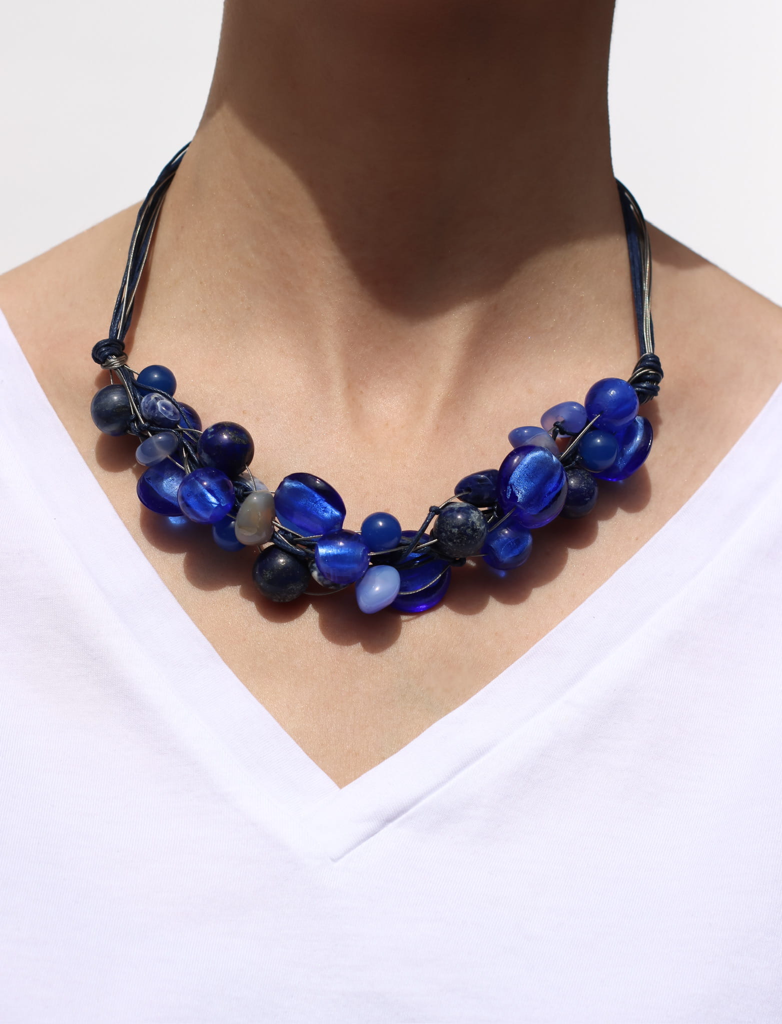 Ciemnoniebieska Sieć Klasyczna to naszyjnik wykonany z kamieni półszlachetnych (lapis lazuli, sodalit, agat, koral niebieski, onyks) i szkła weneckiego.