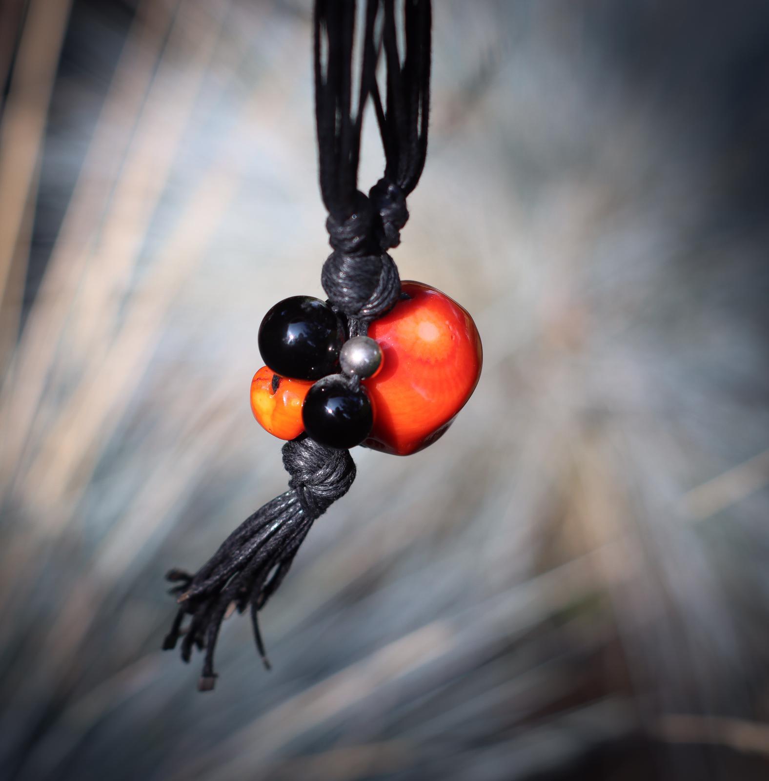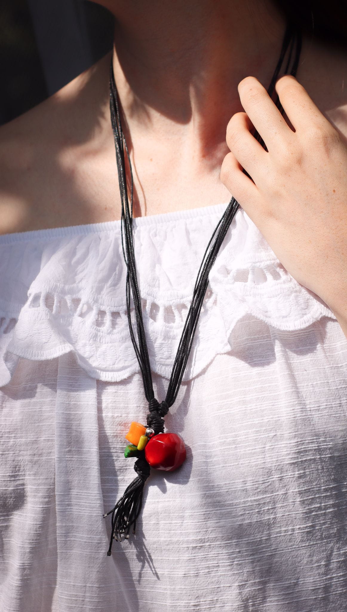 Całość wpleciona w sznurek bawełniany w kolorze czarnym.