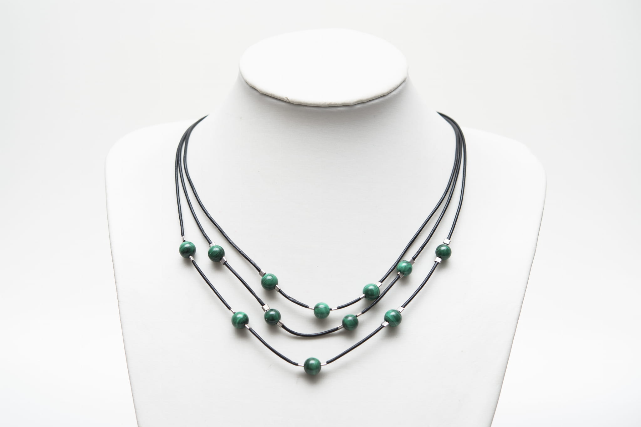 Naszyjnik Forsycja w zieleni wykonana z naturalnego malachit oraz srebra pr. 925 na rzemieniu w kolorze czarnym.