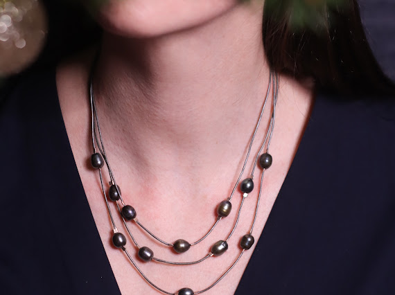 Naszyjnik Forsycja w odcieniach srebra i bieli wykonana z białych pereł hodowanych oraz srebra pr. 925 na rzemieniu w kolorze szaro-srebrnym.