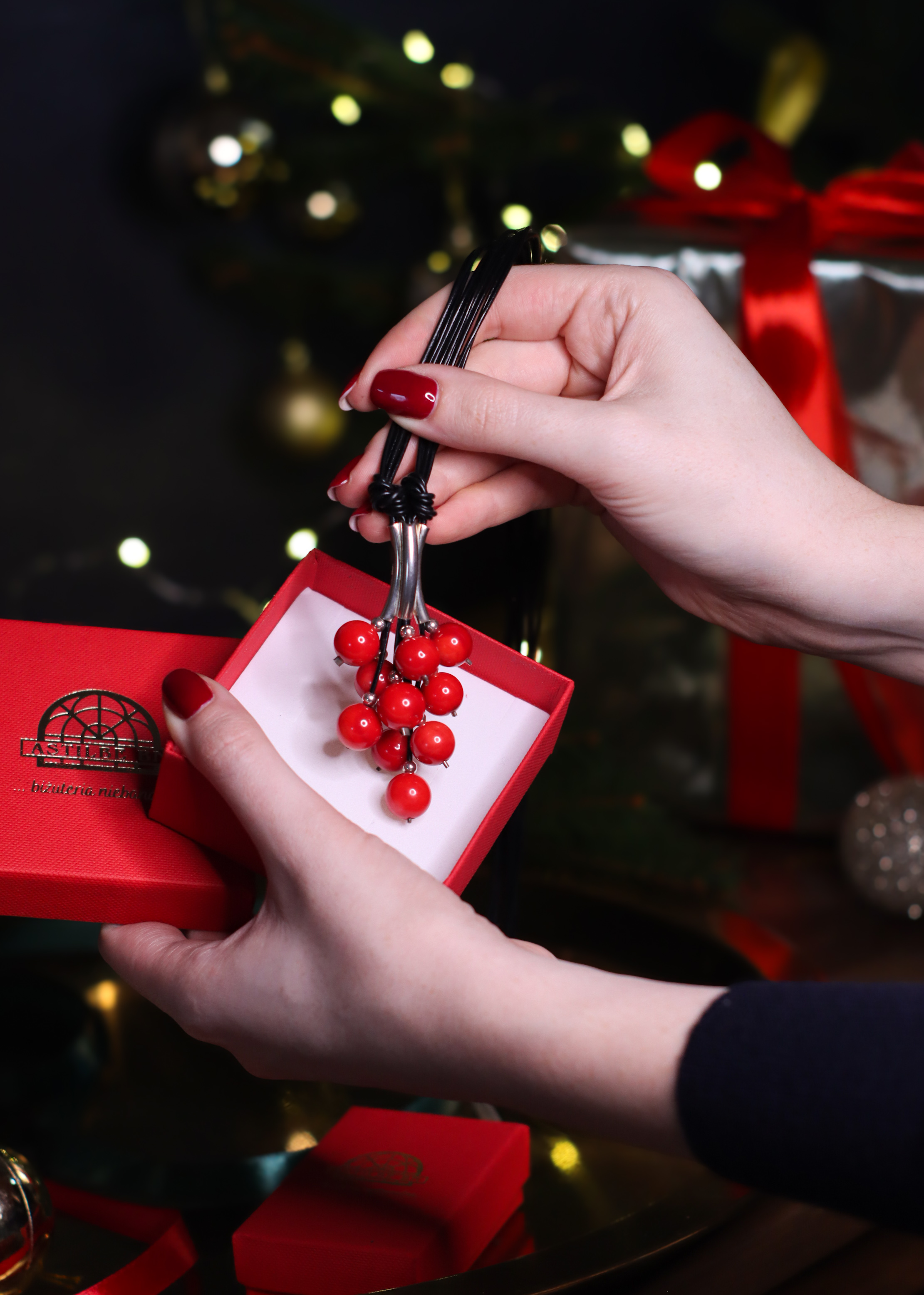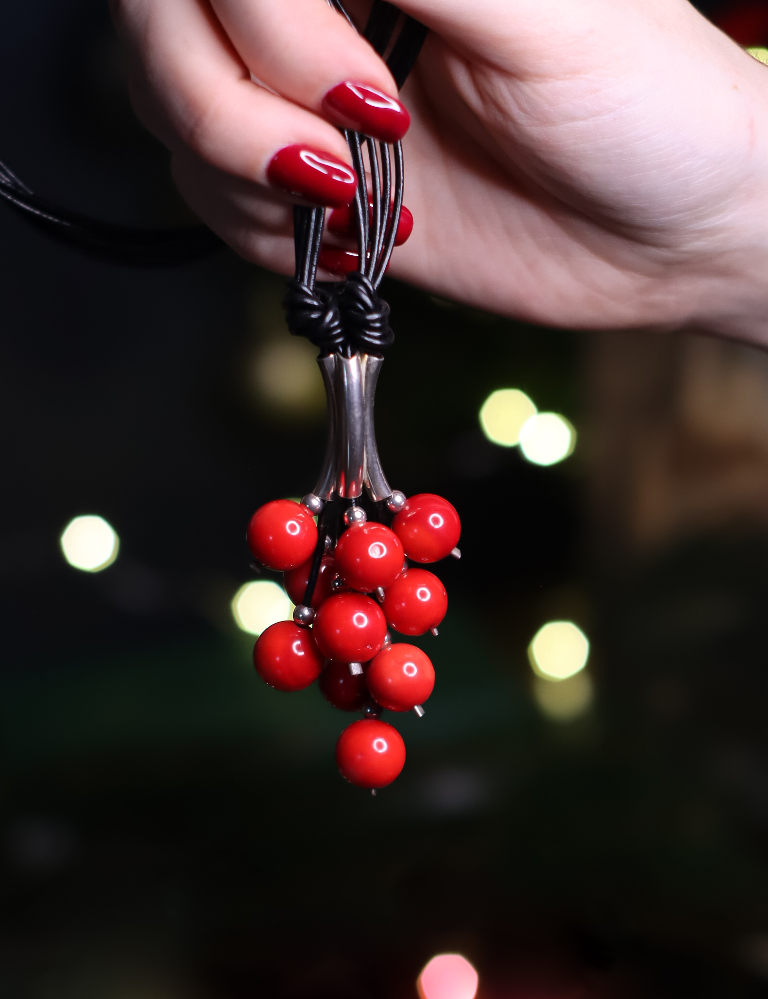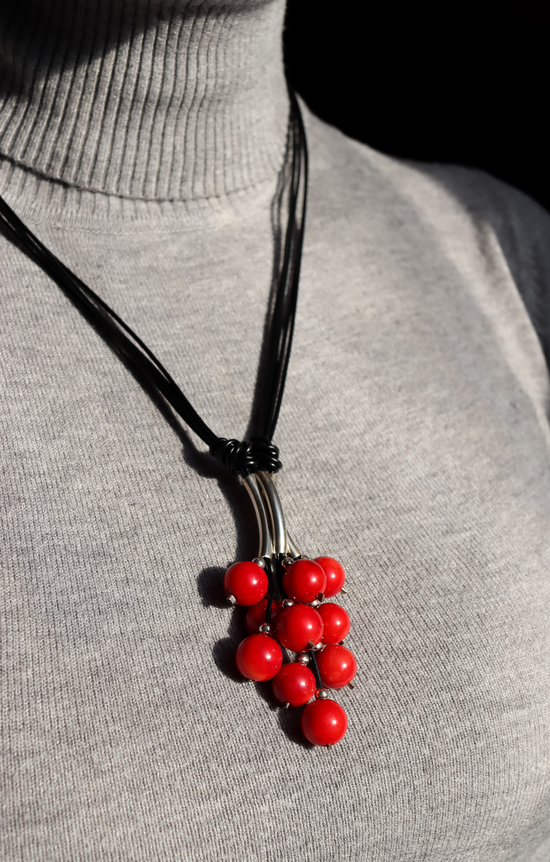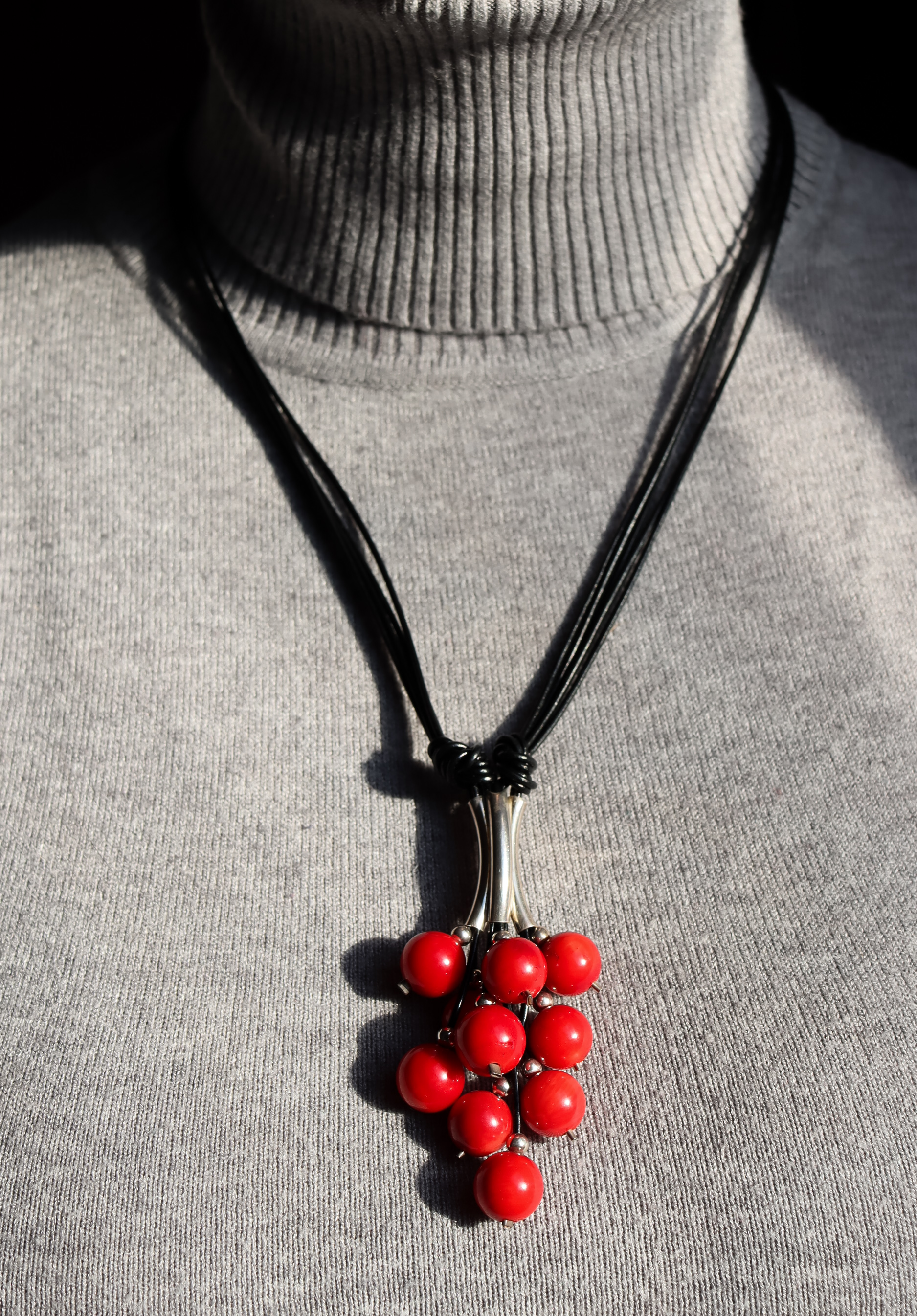 Naszyjnik Grono Exclusive ręcznie wykonany z kuleczek czerwonego korala, srebra pr.925 oraz rzemienia w czarnym kolorze.