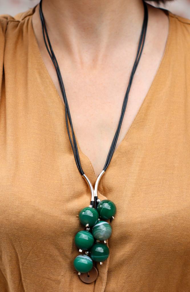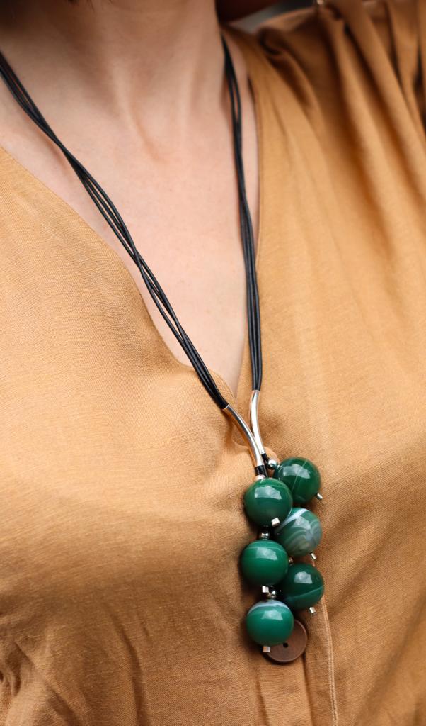 Naszyjnik Grono wykonany z zielonych agatów w kształcie kul, srebra pr.925 oraz rzemienia w czarnym kolorze.