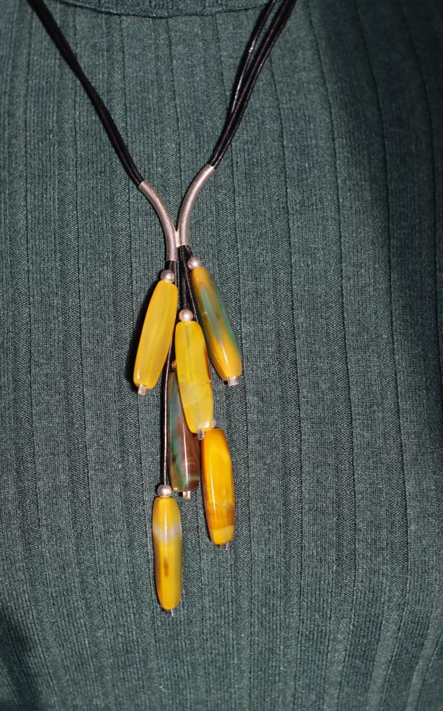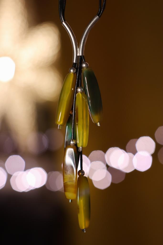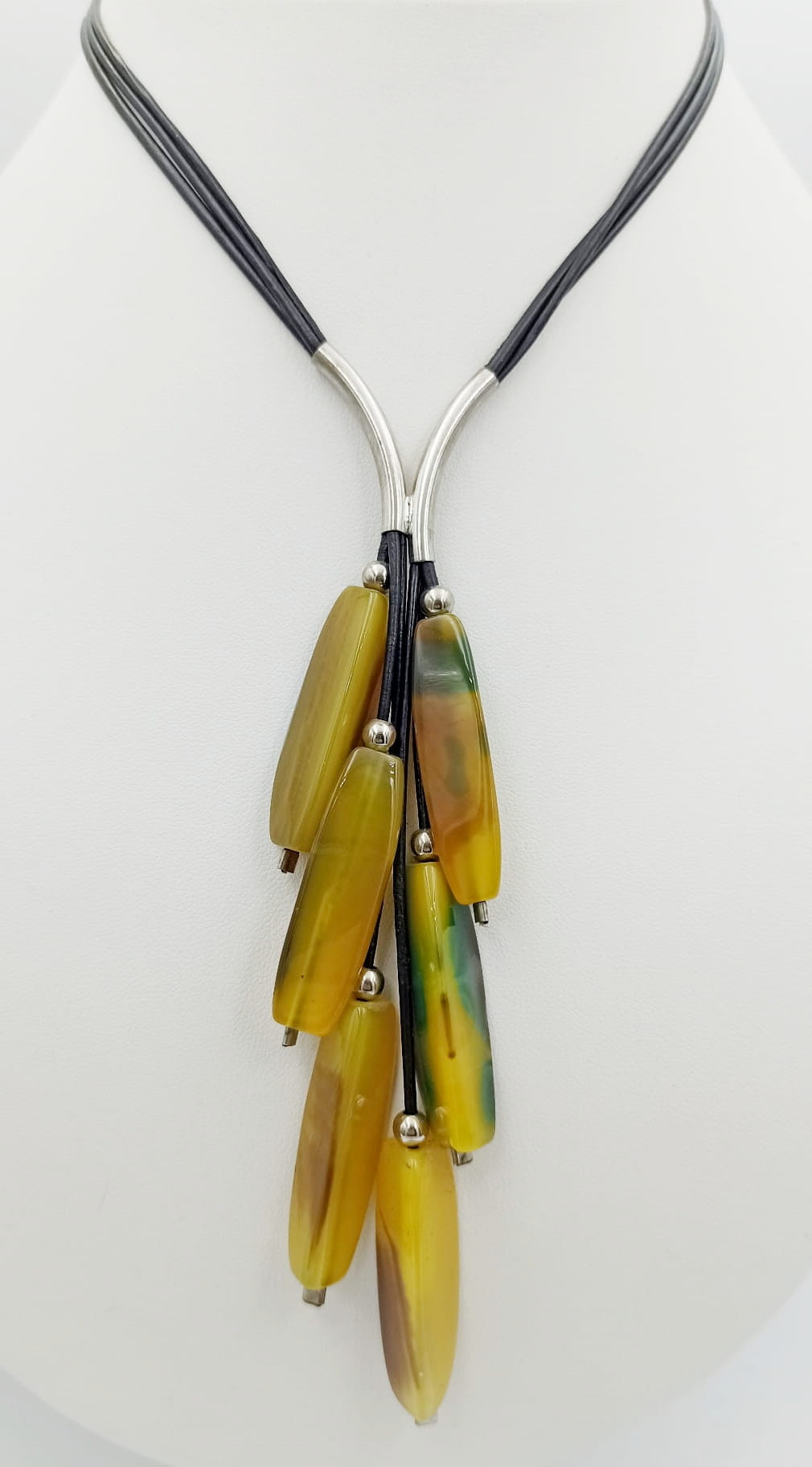 Naszyjnik Grono wykonany z żółto-zielonych agatów w podłużnym kształcie, srebra pr.925 oraz rzemienia w czarnym kolorze.