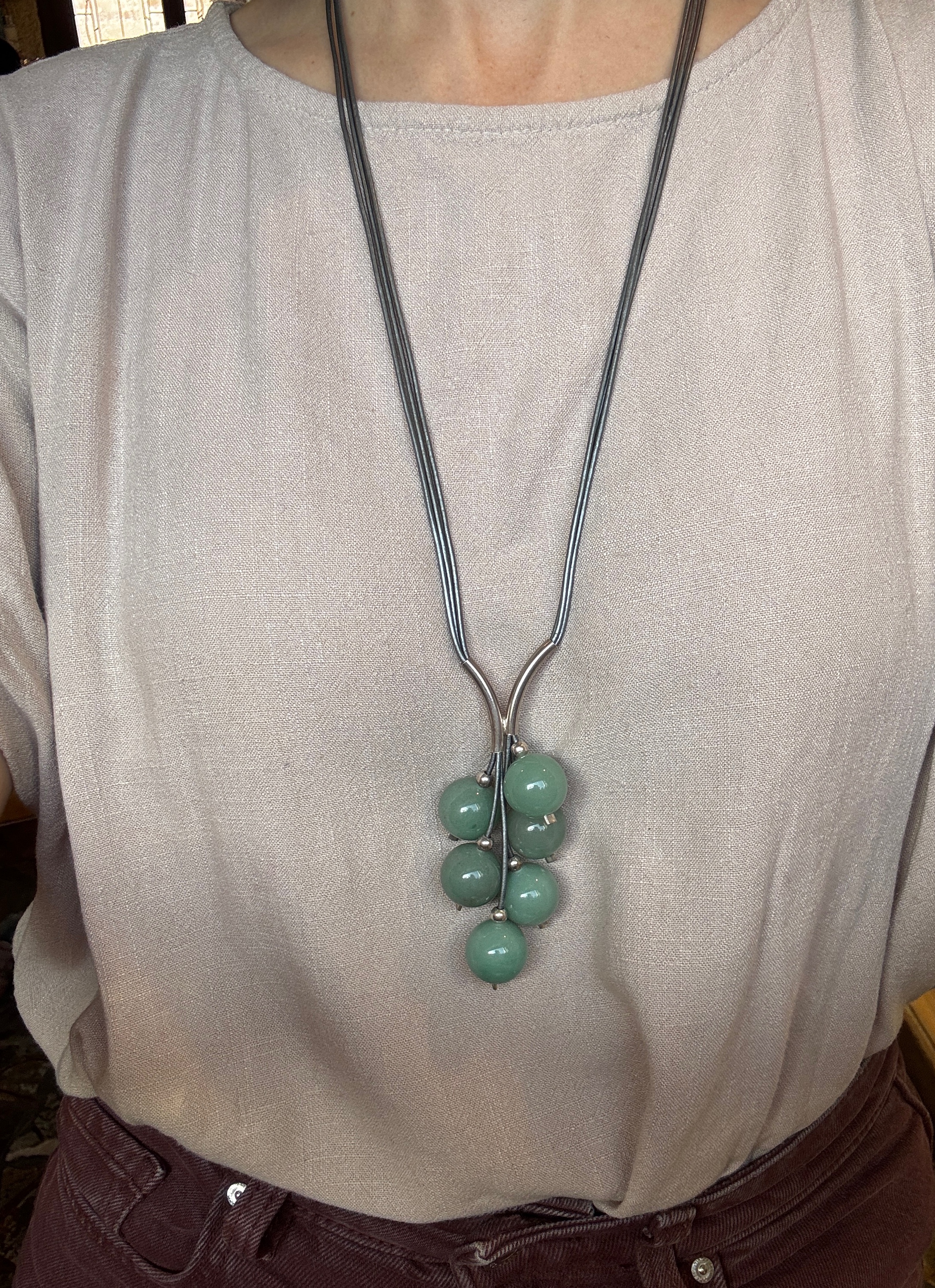 Naszyjnik Grono wykonany z kul zielonego awenturynu, srebra pr.925 oraz rzemienia w kolorze srebrnym