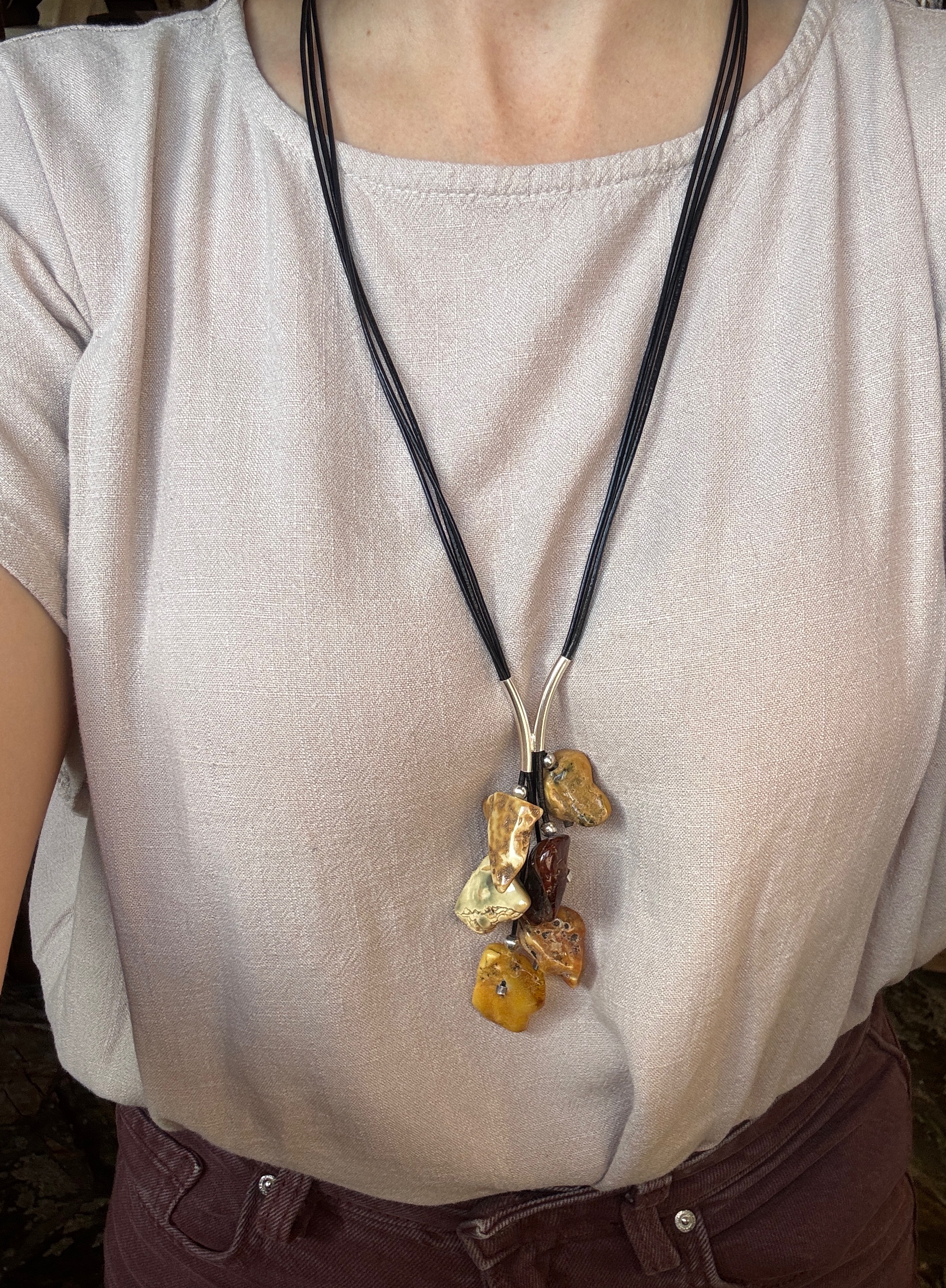 Piękny naszyjnik Grono wykonany z naturalnych bryłek bursztynu srebra pr.925 oraz rzemienia w czarnym  kolorze