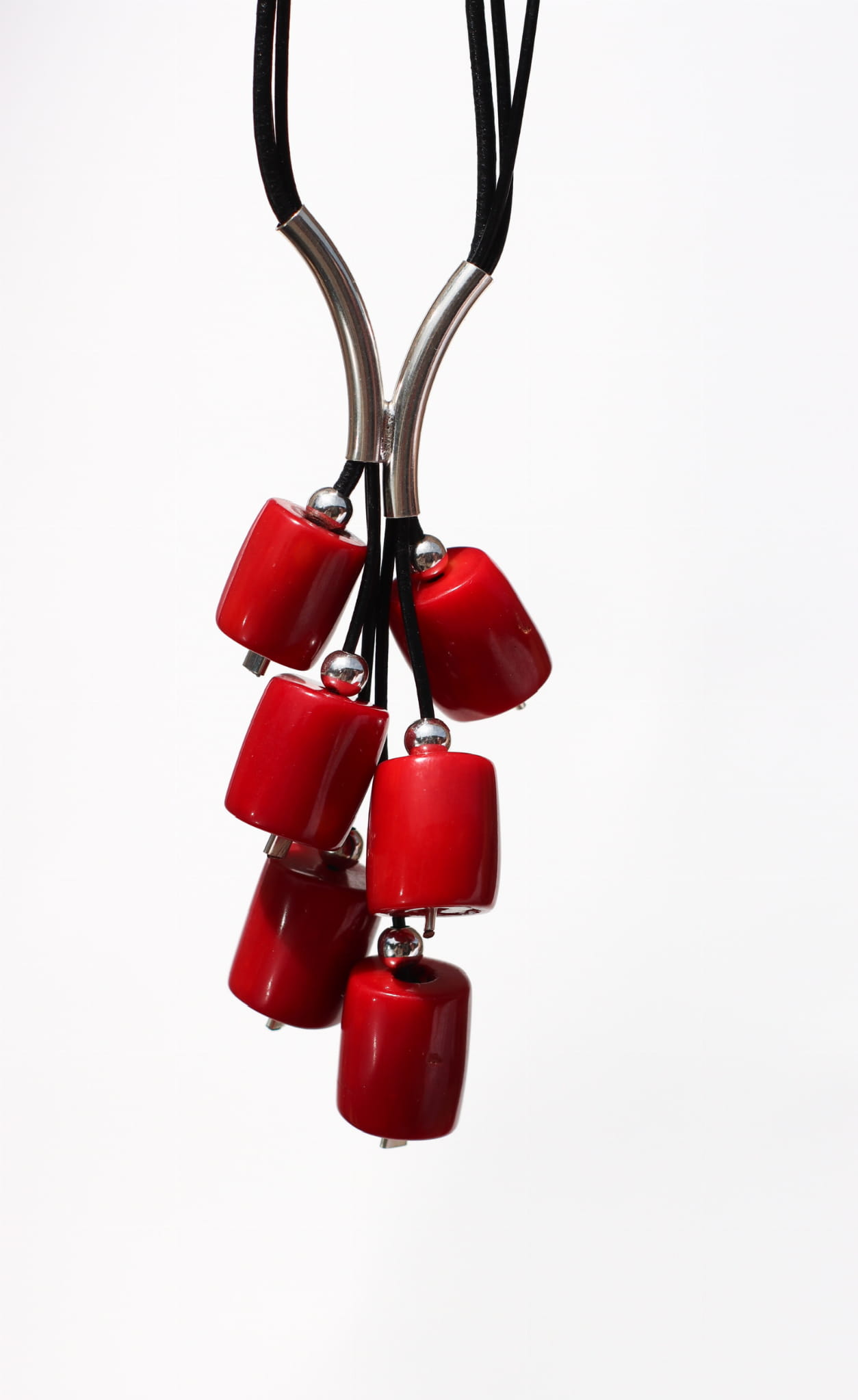 Naszyjnik Grono wykonany z czerwonego korala w kształcie wałeczków, srebra pr.925 oraz rzemienia w czarnym kolorze.