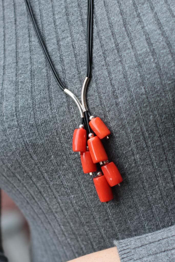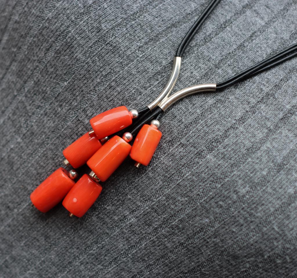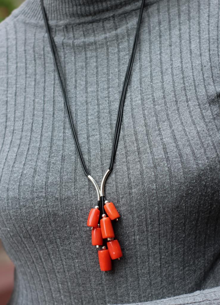 Długi naszyjnik Grono wykonany z pomarańczowego korala w kształcie walców, srebra pr.925 oraz rzemienia w czarnym kolorze.