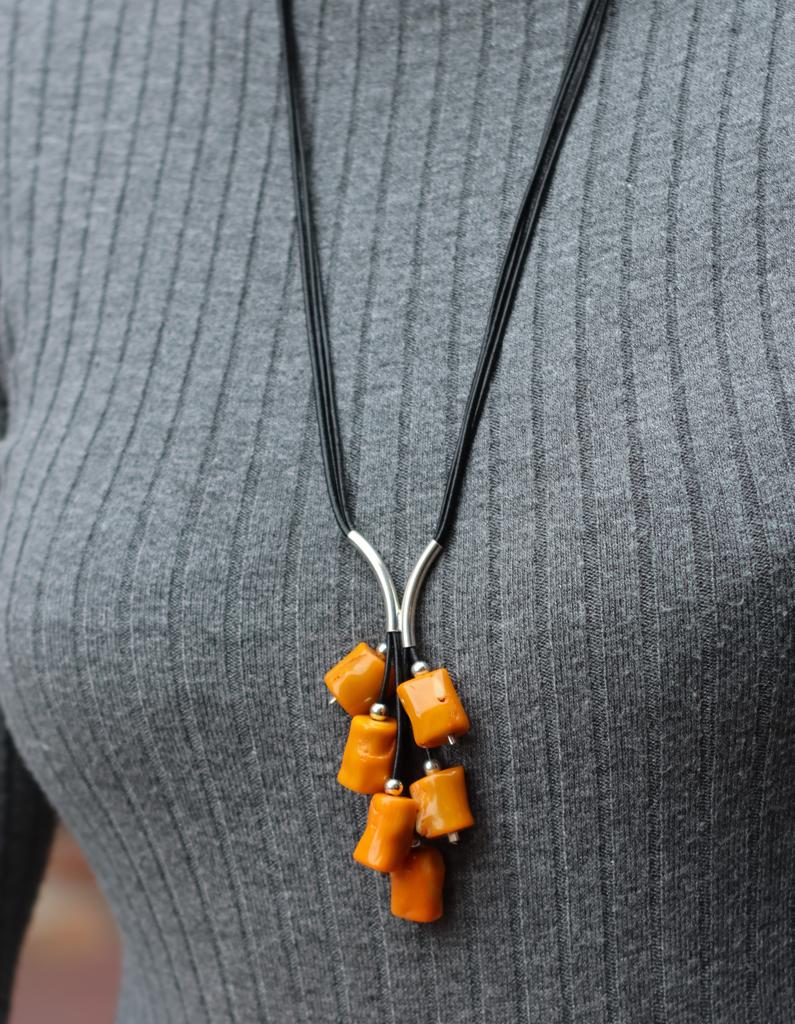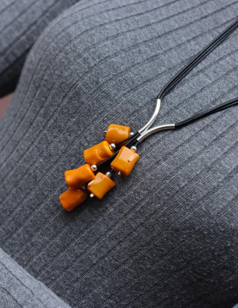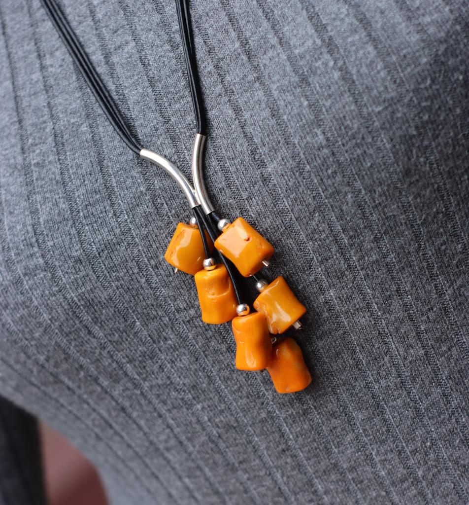 Długi naszyjnik Grono wykonany z żółtego korala w kształcie walców, srebra pr.925 oraz rzemienia w czarnym kolorze.