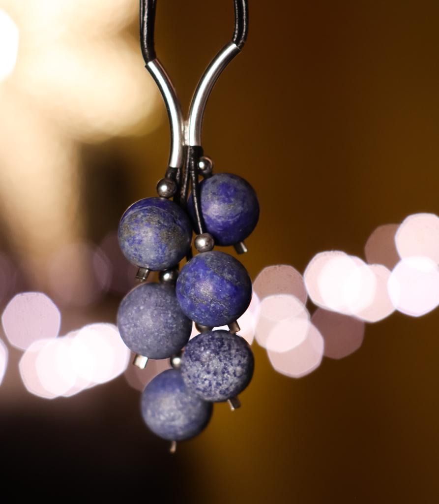 Naszyjnik Grono ręcznie wykonany przez Magdę z matowego lapisu lazuli, srebra pr.925 oraz rzemienia w czarnym kolorze.