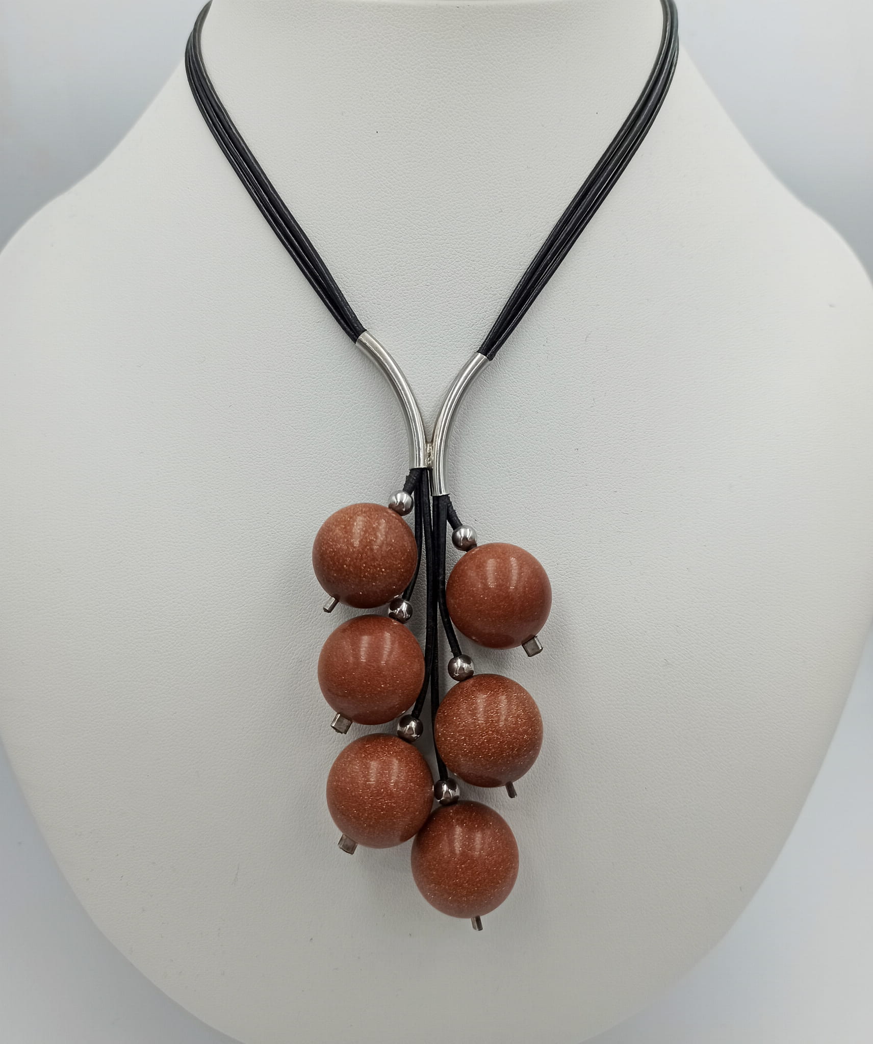 Naszyjnik Grono wykonany z kulek piasku pustyni, srebra pr.925 oraz rzemienia w czarnym kolorze.