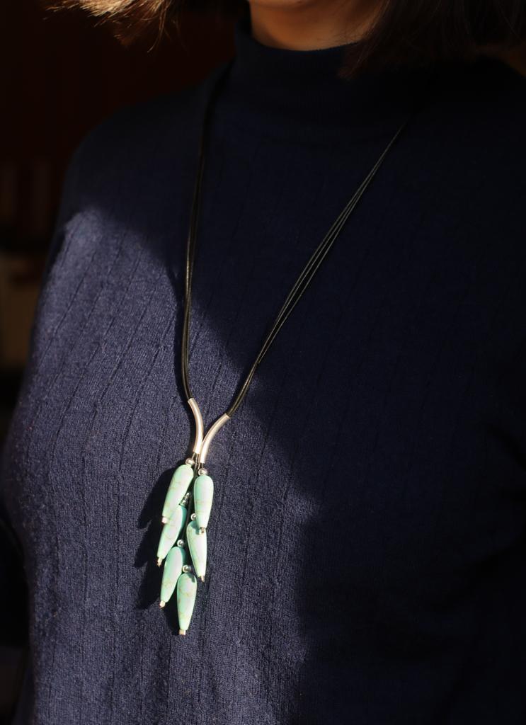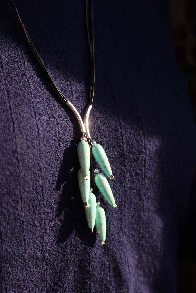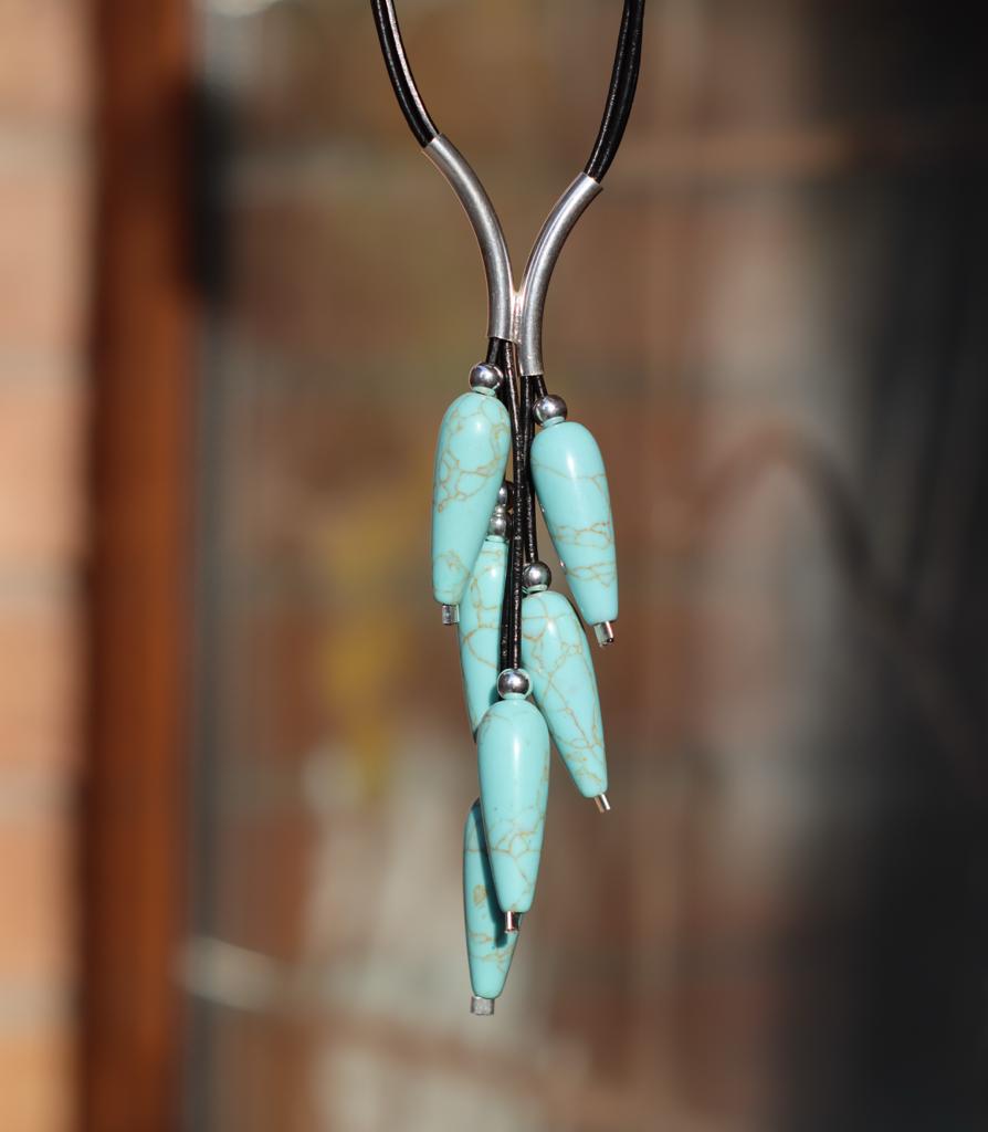 Naszyjnik Grono wykonany z podłużnego błękitnego turkmenitu, srebra pr.925 oraz rzemienia w kolorze czarnym