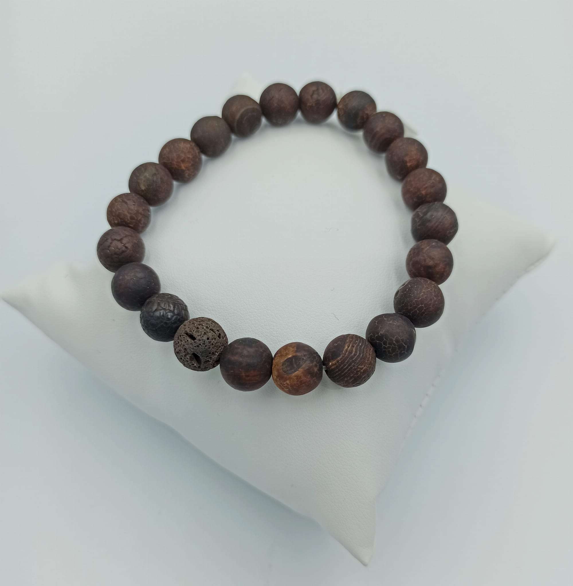 Bransoletka Kilimandżaro z Kolekcji Aromaterapeutycznej wykonana jest z brązowej lawy wulkanicznej oraz brązowych agatów trawionych.